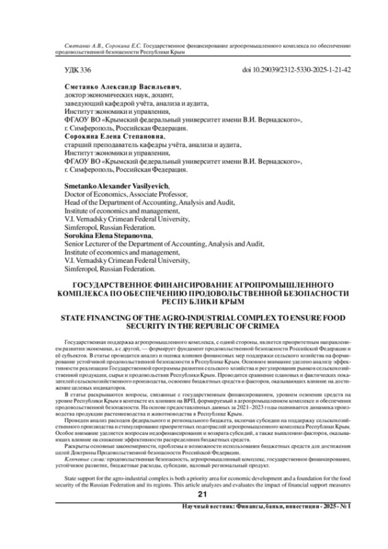 В статье проводится анализ и оценка влияния финансовых мер поддержки сельского хозяйства на формирование устойчивой продовольственной безопасности в Республике Крым. Основное внимание уделено анализу эффективности реализации Государственной программы развития сельского хозяйства и регулирования рынков сельскохозяйственной продукции, сырья и продовольствия Республики Крым. Проводится сравнение плановых и фактических показателей сельскохозяйственного производства, освоение бюджетных средств и факторов, оказывающих влияние на достижение целевых индикаторов. В статье раскрываются вопросы, связанные с государственным финансированием, уровнем освоения средств на уровне Республики Крым в контексте их влияния на ВРП, формируемый в агропромышленном комплексе и обеспечения продовольственной безопасности. На основе предоставленных данных за 2021-2023 годы оценивается динамика производства продукции растениеводства и животноводства в Республике Крым.