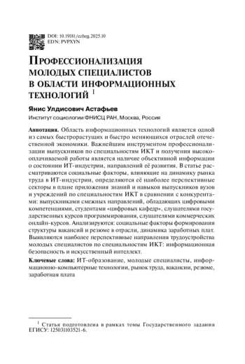 Область информационных технологий является одной из самых быстрорастущих и быстро меняющихся отраслей отечественной экономики. Важнейшим инструментом профессионализации выпускников по специальностям ИКТ и получения высокооплачиваемой работы является наличие объективной информации о состоянии ИТ-индустрии, направлений её развития. В статье рассматриваются социальные факторы, влияющие на динамику рынка труда в ИТ-индустрии, определяются её наиболее перспективные секторы в плане приложения знаний и навыков выпускников вузов и учреждений по специальностям ИКТ в сравнении с конкурентами: выпускниками смежных направлений, обладающих цифровыми компетенциями, студентами «цифровых кафедр», слушателями государственных курсов программирования, слушателями коммерческих онлайн-курсов. Анализируются: социальные факторы формирования структуры вакансий и резюме в отрасли, динамика заработных плат. Выявляются наиболее перспективные направления трудоустройства молодых специалистов по специальностям ИКТ: информационная безопасность и искусственный интеллект.