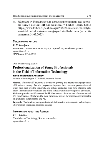 17. Астафьев Я. У. Молодые специалисты на рынке труда информационно-компьютерных технологий // Профессиональное образование в современном мире. 2023. № 13 (4). С. 641-642. 10.20913/2618-7515-2023-4- 5. DOI: 10.20913/2618-7515-2023-4-5