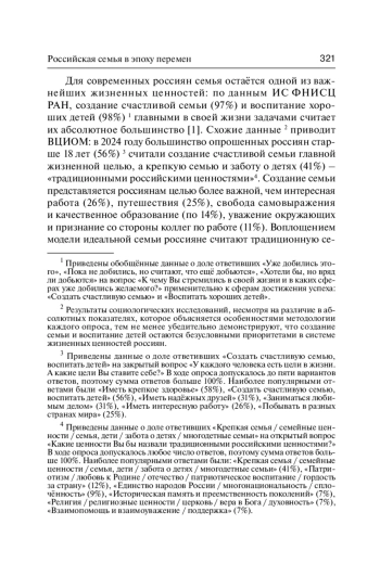 Для современных россиян семья остаётся одной из важнейших жизненных ценностей: по данным ИС ФНИСЦ РАН, создание счастливой семьи (97%) и воспитание хороших детей (98%) 1 главными в своей жизни задачами считает их абсолютное большинство [1]. Схожие данные 2 приводит ВЦИОМ: в 2024 году большинство опрошенных россиян старше 18 лет (56%) 3 считали создание счастливой семьи главной жизненной целью, а крепкую семью и заботу о детях (41%) – «традиционными российскими ценностями»4.