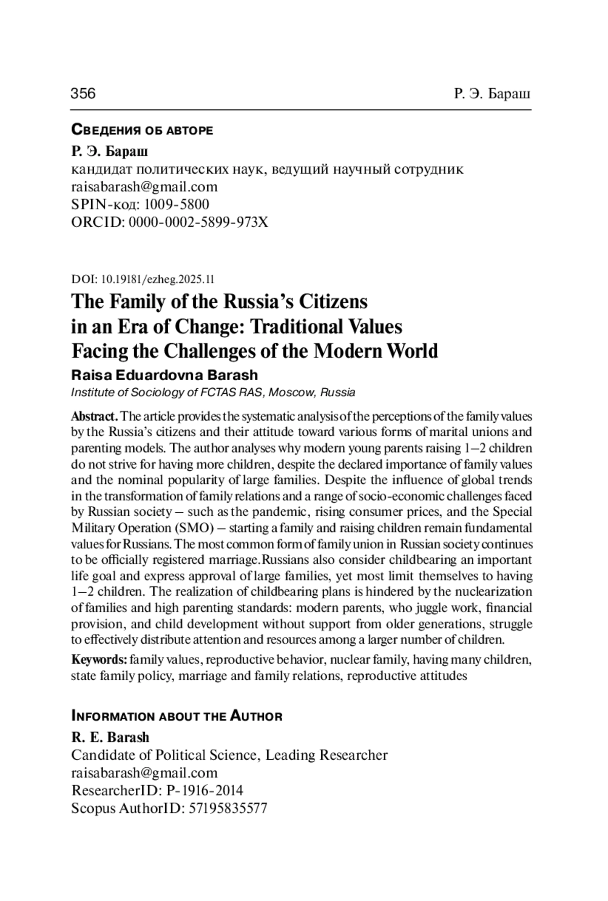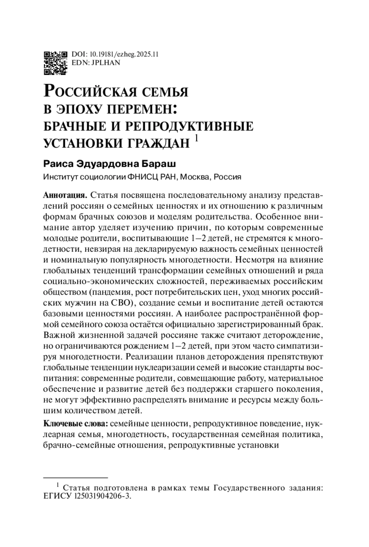 Статья посвящена последовательному анализу представлений россиян о семейных ценностях и их отношению к различным формам брачных союзов и моделям родительства. Особенное внимание автор уделяет изучению причин, по которым современные молодые родители, воспитывающие 1–2 детей, не стремятся к многодетности, невзирая на декларируемую важность семейных ценностей и номинальную популярность многодетности. Несмотря на влияние глобальных тенденций трансформации семейных отношений и ряда социально-экономических сложностей, переживаемых российским обществом (пандемия, рост потребительских цен, уход многих российских мужчин на СВО), создание семьи и воспитание детей остаются базовыми ценностями россиян. А наиболее распространённой формой семейного союза остаётся официально зарегистрированный брак. Важной жизненной задачей россияне также считают деторождение, но ограничиваются рождением 1–2 детей, при этом часто симпатизируя многодетности. Реализации планов деторождения препятствуют глобальные тенденции нуклеаризации семей и высокие стандарты воспитания: современные родители, совмещающие работу, материальное обеспечение и развитие детей без поддержки старшего поколения, не могут эффективно распределять внимание и ресурсы между большим количеством детей.