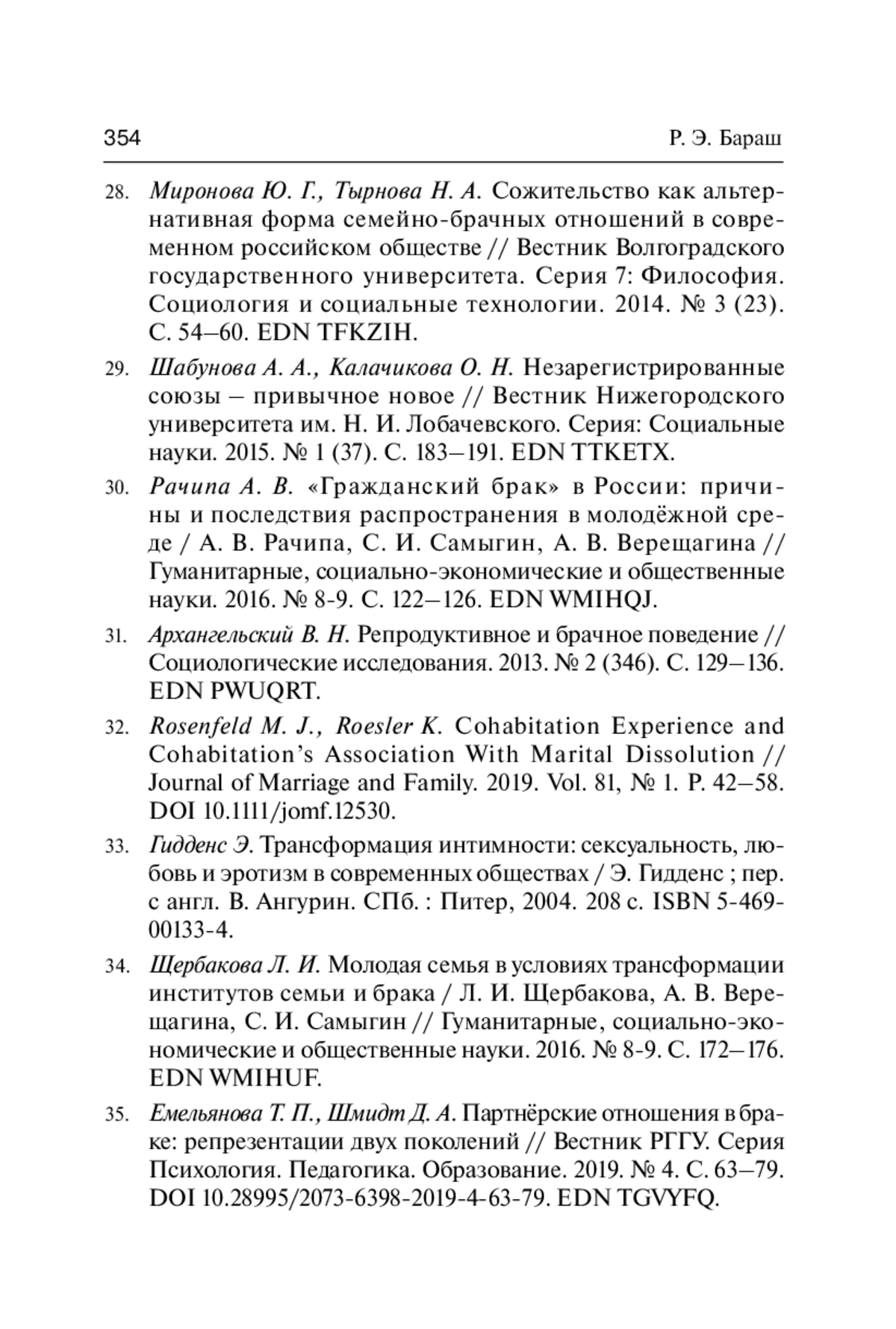 8. Артамонова А. В., Митрофанова Е. С. Сожительства в России: промежуточное звено или легитимный институт // Мониторинг общественного мнения: экономические и социальные перемены. 2016. № 1 (131). С. 126-145. DOI: 10.14515/monitoring.2016.1.04