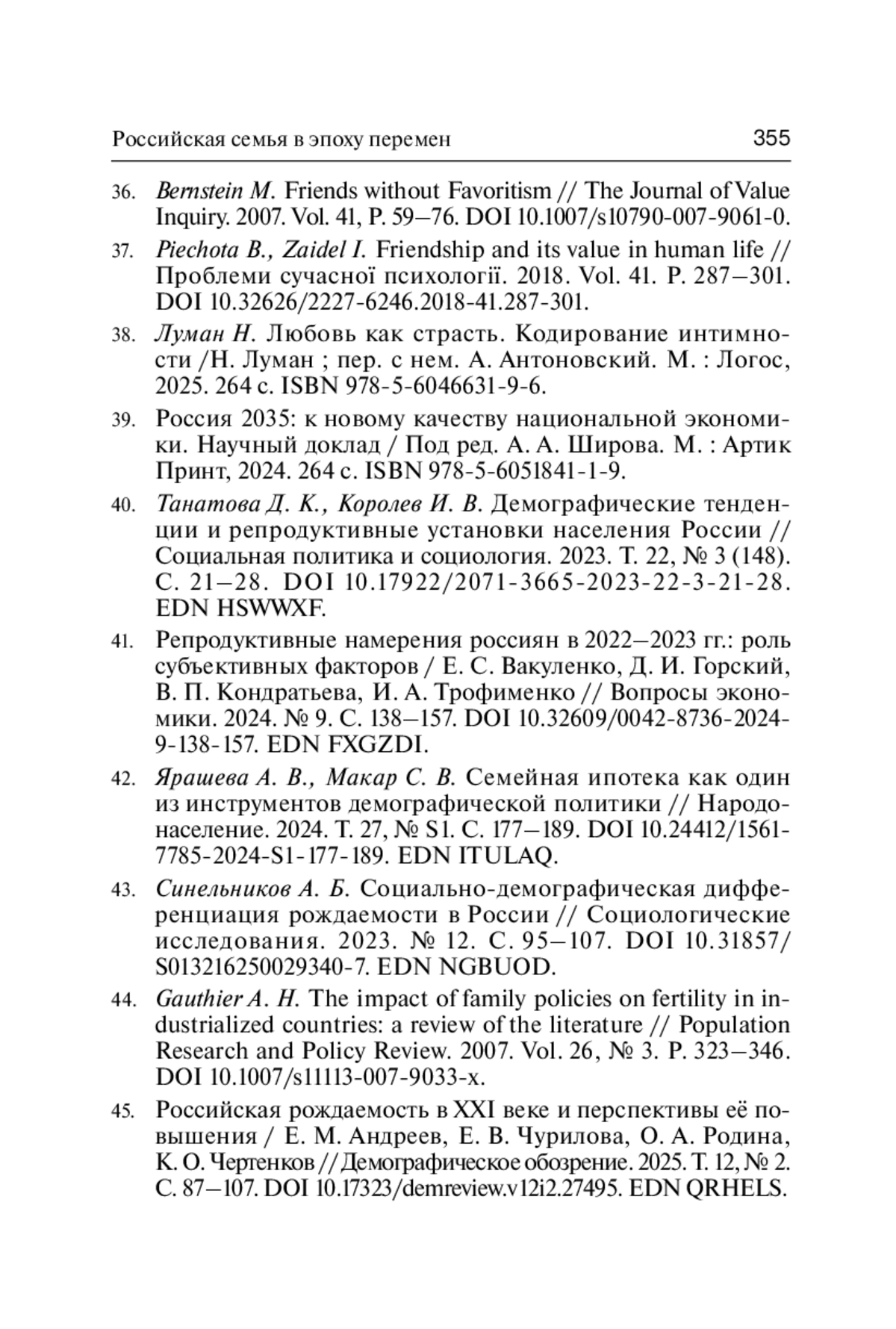 40. Танатова Д. К., Королев И. В. Демографические тенденции и репродуктивные установки населения России // Социальная политика и социология. 2023. Т. 22, № 3 (148). С. 21-28. DOI: 10.17922/2071-3665-2023-22-3-21-28