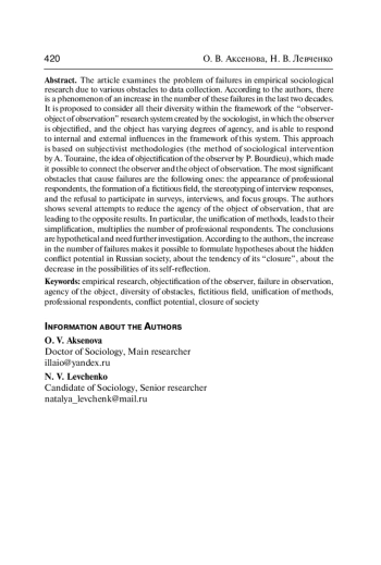 В статье рассматривается проблема сбоев в эмпирических социологических исследованиях, происходящих по причине возникновения разного рода препятствий для сбора данных. По мнению авторов, существует феномен нарастания числа указанных сбоев в последние два десятилетия. Предлагается всё их разнообразие рассматривать в рамках создаваемой социологом исследовательской системы «наблюдатель-объект наблюдения», в которой наблюдатель объективируется, а объект обладает разной степени субъектности и способен реагировать на внутренние и внешние по отношению к данной системе воздействия. В основании такого подхода лежат субъективистские методологии (метод социологической интервенции А. Турэна, идея объективации наблюдателя П. Бурдьё), позволившие соединить субъект и объект наблюдения. Наиболее значимыми среди вызывающих сбои препятствий можно считать появление профессиональных респондентов и формирование фиктивного поля, стереотипизацию ответов в интервью, отказ от участия в опросах, интервью, фокус-группах. Показаны некоторые попытки снизить субъектность объекта наблюдения, приводящие к обратным результатам. В частности, унификация методик, ведущая к их упрощению, умножает число профессиональных респондентов. Выводы носят гипотетический характер и нуждаются в дальнейшем исследовании. По мнению авторов увеличение количества сбоев позволяет сформулировать гипотезы о скрытом конфликтном потенциале в российском обществе, о тенденции его «закрытия», о снижении возможностей его саморефлексии.