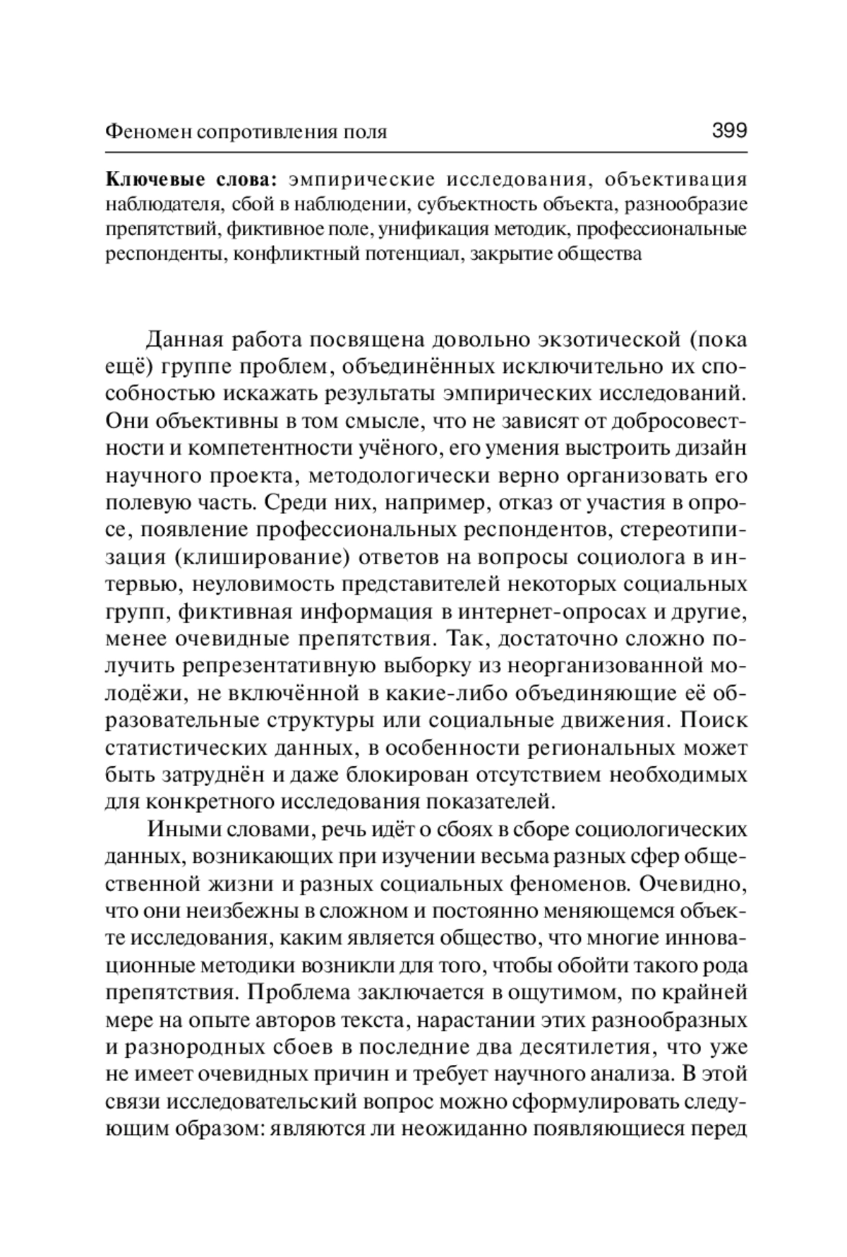 Данная работа посвящена довольно экзотической (пока ещё) группе проблем, объединённых исключительно их способностью искажать результаты эмпирических исследований. Они объективны в том смысле, что не зависят от добросовестности и компетентности учёного, его умения выстроить дизайн научного проекта, методологически верно организовать его полевую часть. Среди них, например, отказ от участия в опросе, появление профессиональных респондентов, стереотипизация (клиширование) ответов на вопросы социолога в интервью, неуловимость представителей некоторых социальных групп, фиктивная информация в интернет-опросах и другие, менее очевидные препятствия. Так, достаточно сложно получить репрезентативную выборку из неорганизованной молодёжи, не включённой в какие-либо объединяющие её образовательные структуры или социальные движения. Поиск статистических данных, в особенности региональных может быть затруднён и даже блокирован отсутствием необходимых для конкретного исследования показателей.