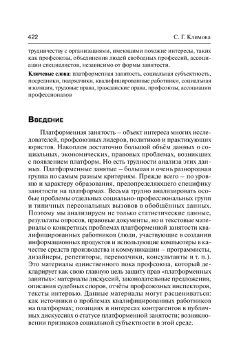 Статья посвящена анализу проблем квалифицированных работников, которые предлагают услуги заказчикам на цифровых платформах. Основные темы статьи: функции цифровой платформы во взаимодействии с заказчиками и подрядчиками; потенциал квалифицированных работников как социальных субъектов в специфических условиях безличного взаимодействия с модераторами цифровой платформы (в частности, возможности квалифицированных подрядчиков навязывать платформе-посреднику свои регламенты работы или хотя бы заявлять о них); возможности защиты гражданских прав подрядчиков. Субъектность подрядчиков – работников квалифицированного труда на платформах – ограничена возможностью принимать решения о сотрудничестве с платформой или отказываться от сотрудничества. Они не могут навязывать платформе-посреднику свои правила; у них нет ресурсов для защиты своих интересов. Они могут защититься от произвола платформ лишь в случае доказанного наличия фактических трудовых отношений в соответствии с Трудовым кодексом. В статье анализируется деятельность профсоюза, который декларирует главной задачей защиту платформенных работников как подрядчиков в соответствии с нормами Гражданского кодекса, а не как наёмных работников. Формы защиты: трудовые инспекции, защита подрядчиков в судах, законодательные инициативы и др. Сейчас становится актуальной тема трансформации прежних или создания новых практик, которые служили бы профессиональной коммуникации, согласованию и формулированию интересов квалифицированных работников, занятых на платформах; а в перспективе – развитию социальной субъектности: формированию реальных общностей и сотрудничеству с организациями, имеющими похожие интересы, таких как профсоюзы, объединения людей свободных профессий, ассоциации специалистов, независимо от формы занятости.