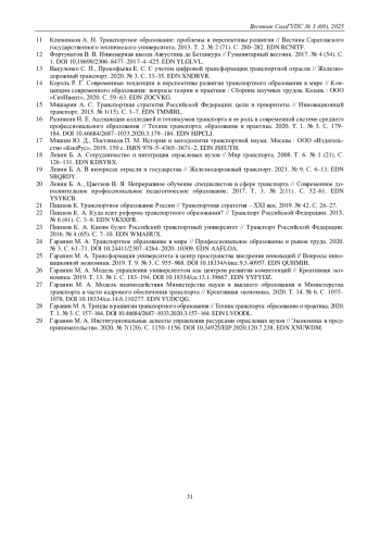 21. Пашков К. Транспортное образование России // Транспортная стратегия - XXI век. 2019. № 42. С. 26-27.
