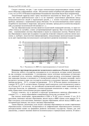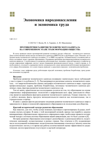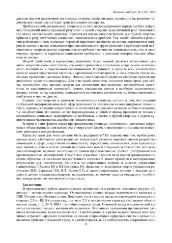 В статье приведен анализ противоречий развития основного ресурса общества - человеческого капитала. Дана количественная оценка вклада человеческого капитала в ВВП России и зарубежных стран. Показано, что в среднем вклад человеческого капитала составляет 2/3 от ВВП государства. Основной вклад в человеческий капитал составляют люди с высшим образованием. Основными причинами противоречия развития человеческого капитала являются: 1) необходимость в развитии роботизации всех значимых отраслей народного хозяйства на основе современных цифровых систем с целью повышения производительности труда, с одной стороны, и, 2) необходимость тотального сокращения многих специальностях в виду применения роботизации промышленности и сферы обслуживания, что в свою очередь приводит к серьезным социально - экономическим проблемам.
