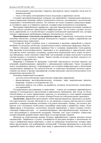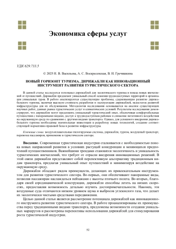В данной статье исследуется потенциал дирижаблей для экологического туризма и поиска новых впечатлений от путешествий. Дирижабли предлагают уникальный способ освоения труднодоступных территорий и организации уникальных туров. В работе анализируются существующие проблемы, сдерживающие развитие дирижабельного туризма, включая высокую стоимость разработки и эксплуатации дирижаблей, недостаток развитой инфраструктуры для их обслуживания. Методология исследования основывается на анализе существующих научных работ, данных рынка туристических услуг и климатических условий. Результаты исследования демонстрируют, что дирижабли могут предложить уникальный туристический опыт, обеспечивая комфортабельные путешествия с панорамными видами, доступ к труднодоступным районам и снижение негативного воздействия на окружающую среду по сравнению с другими видами транспорта. Однако, для успешного внедрения дирижабельного туризма необходимы значительные инвестиции в разработку новых технологий, создание соответствующей нормативно - правовой базы и развитие инфраструктуры.