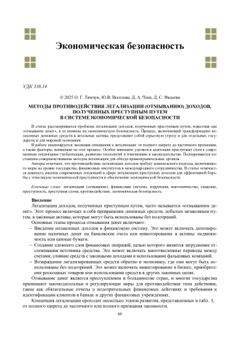 В статье рассматривается проблема легализации доходов, полученных преступным путем, известная как «отмывание денег», и ее влияние на экономическую безопасность. Процесс, включающий трансформацию незаконных денежных средств в легальные активы, представляет собой серьезную угрозу и для отдельных государств, и для мировой экономики. В работе анализируется эволюция отношения к легализации: от полного запрета до частичного признания, а также факторы, влияющие на этот процесс. Особое внимание уделяется адаптации преступных схем к современным тенденциям глобализации, развитию технологий и изменениям в законодательстве. Подчеркивается постоянное совершенствование методов легализации для обхода правоохранительных органов. Авторы отмечают, что противодействие легализации доходов требует комплексного подхода, включающего меры на уровне государства, финансовых институтов и международного сотрудничества. В статье отмечается важность анализа современных тенденций в сфере легализации преступных доходов для эффективной борьбы с этим видом экономической преступности и обеспечения экономической безопасности.