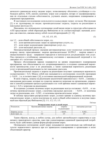 В статье рассматривается вопрос оптимизации структуры себестоимости затрат автотранспортных предприятий (АТП). Актуальность рассмотрения обусловлена необходимостью в рамках государственной стратегии обеспечить снижение себестоимости транспортных услуг и одновременно стабильную работу предприятий. Предметом исследования и объектом оптимизации явилась структура себестоимости затрат АТП, а целью её оптимизации - стабильная устойчивая работа предприятия. В качестве подхода к решению проблемы выбрана модель оптимального соотношения долей затрат предприятия материально - вещественного производства: производство + реализация + накладные расходы в виде 50:30:20 в процентах. С этой целью в калькуляции себестоимости затрат АТП методом группировки её статей обособлены: производительные затраты, затраты на реализацию и накладные расходы. Данный подход в исследованиях на автомобильном транспорте ранее не применялся ввиду специфики транспортной услуги, которая производится и реализуется одновременно. Анализ распределения названных затрат в общей себестоимости показал приблизительное соответствие их значений последовательности чисел обратного ряда Фибоначчи: 1/1;1/2;1/3;1/5. Отклонение от оптимальных значений находится в пределах 10 %. Путем моделирования изучен механизм формирования оптимального соотношения долей видов затрат, подтверждающий закономерность. Предложен метод практического достижения оптимального соотношения затрат АТП. Выявлены новые соотношения между видами затрат в себестоимости, позволяющие при известной величине производительных затрат быстро определять общую себестоимость и другие виды затрат АТП и использовать их в том числе в анализе, планировании, оперативном управлении, разработке транспортных тарифов предприятия.