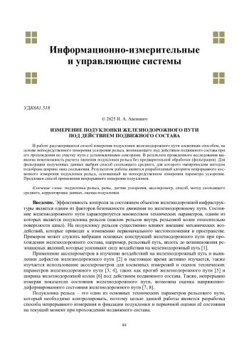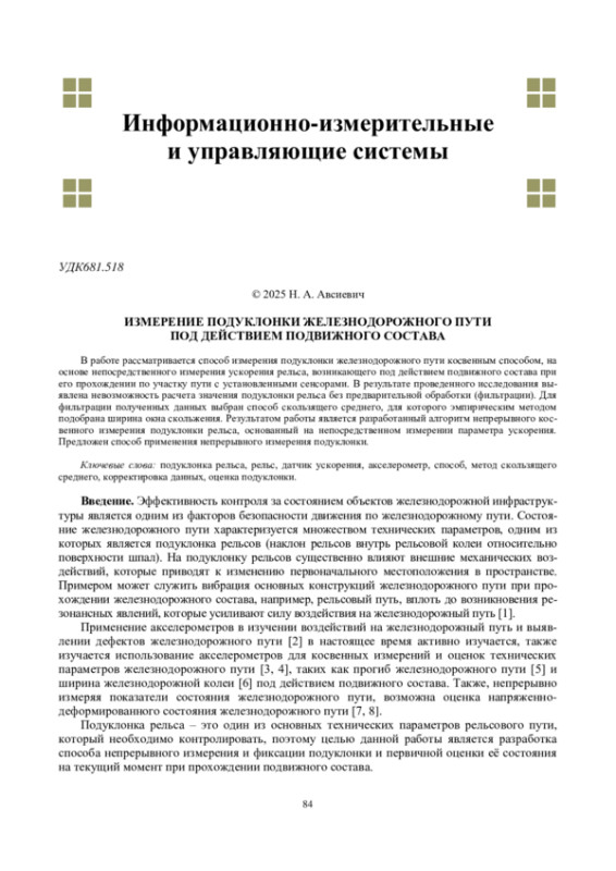 3. Авсиевич Н. А., Авсиевич А. В. Контроль параметров рельсовой колеи с помощью акселерометров // Труды международного симпозиума “Надежность и качество”. 2025. Т. 2. С. 247-250.