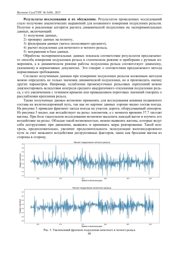 В работе рассматривается способ измерения подуклонки железнодорожного пути косвенным способом, на основе непосредственного измерения ускорения рельса, возникающего под действием подвижного состава при его прохождении по участку пути с установленными сенсорами. В результате проведенного исследования выявлена невозможность расчета значения подуклонки рельса без предварительной обработки (фильтрации). Для фильтрации полученных данных выбран способ скользящего среднего, для которого эмпирическим методом подобрана ширина окна скольжения. Результатом работы является разработанный алгоритм непрерывного косвенного измерения подуклонки рельса, основанный на непосредственном измерении параметра ускорения. Предложен способ применения непрерывного измерения подуклонки.