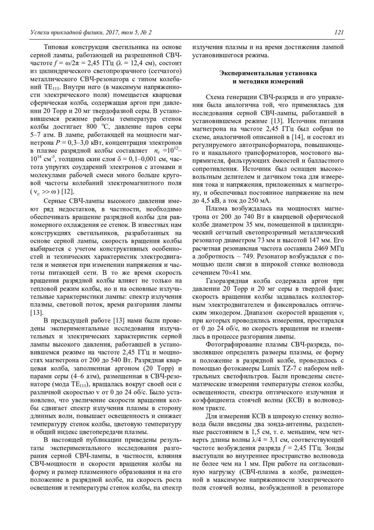 Проведено экспериментальное исследование разгорания безэлектродной серной СВЧ-лампы высокого давления. Разряд зажигался и поддерживался в парах серы и аргоне (20 Торр) в кварцевой колбе диаметром 35 мм, размещенной в цилиндрическом резонаторе диаметром 73 мм и высотой 147 мм. Колба вращалась с угловой скоростью v от 0 до 24 об/с, плазма возбуждалась на частоте 2,45 ГГц при мощности магнетрона 200–740 Вт. Обнаружено, что появление светового потока (освещенности) лампы после зажигания в колбе СВЧразряда происходит с задержкой tз, которая не зависит от скорости вращения колбы, но уменьшается с увеличением мощности магнетрона. В процессе разгорания лампы наблюдалось изменение формы плазмы СВЧ-разряда и ее положения в колбе, которые определялись скоростью вращения колбы и мощностью магнетрона. Зависимость освещенности лампы от времени ее разгорания t имела максимум Еmax, положение которого, tmax, с увеличением мощности магнетрона и скорости вращения колбы сдвигалось в сторону меньших значений t. С увеличением скорости вращения колбы v от 0 до 7–8 об/с уменьшалось время достижения лампой установившегося режима tуст., возрастала максимальная освещенность Еmax, а спектр излучения плазмы сдвигался в длинноволновую область. Увеличение скорости вращения колбы свыше 8 об/с вызывало снижение освещенности и рост tуст.
