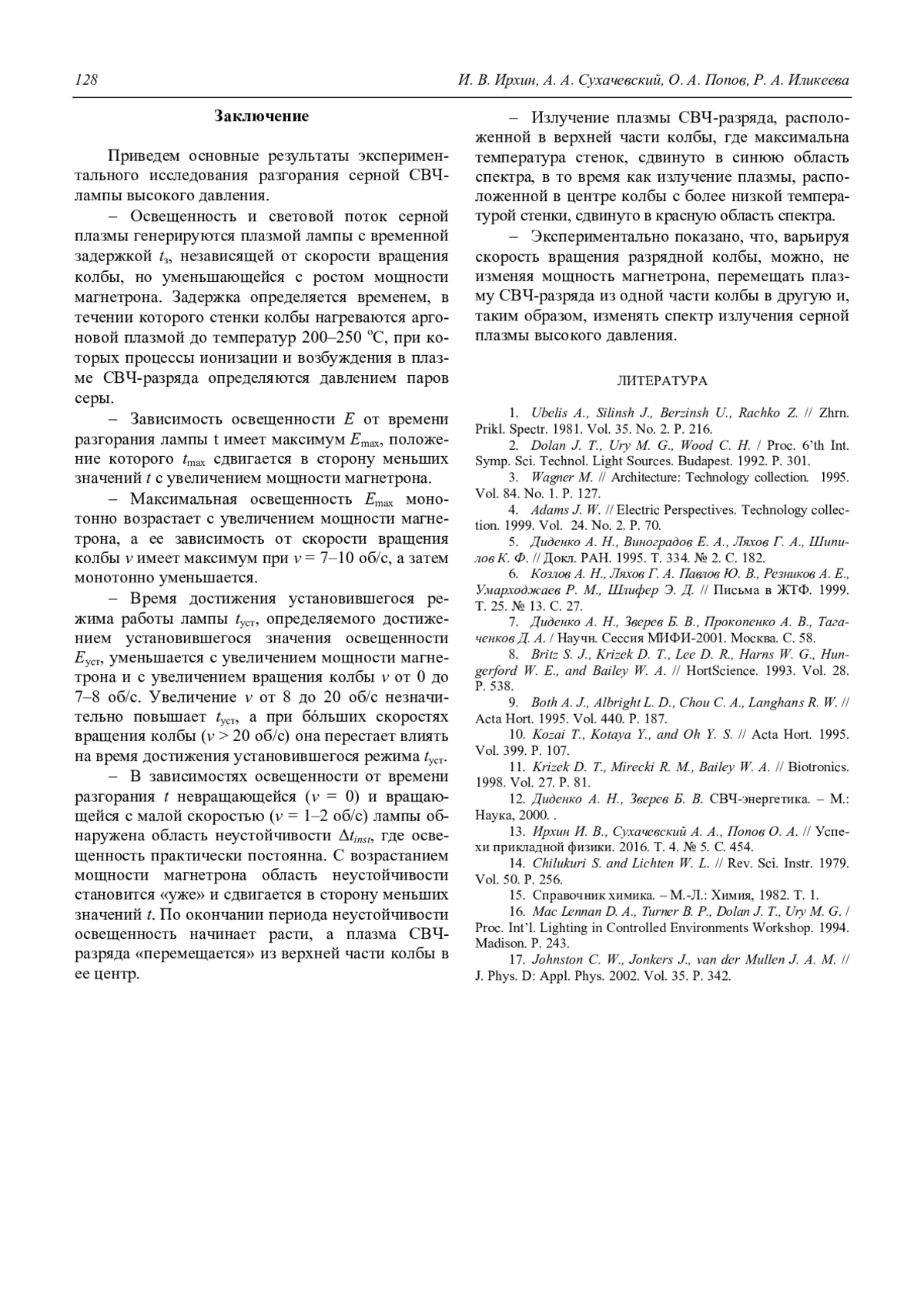 13. Ирхин И. В., Сухачевский А. А., Попов О. А. // Успехи прикладной физики. 2016. Т. 4. № 5. С. 454.