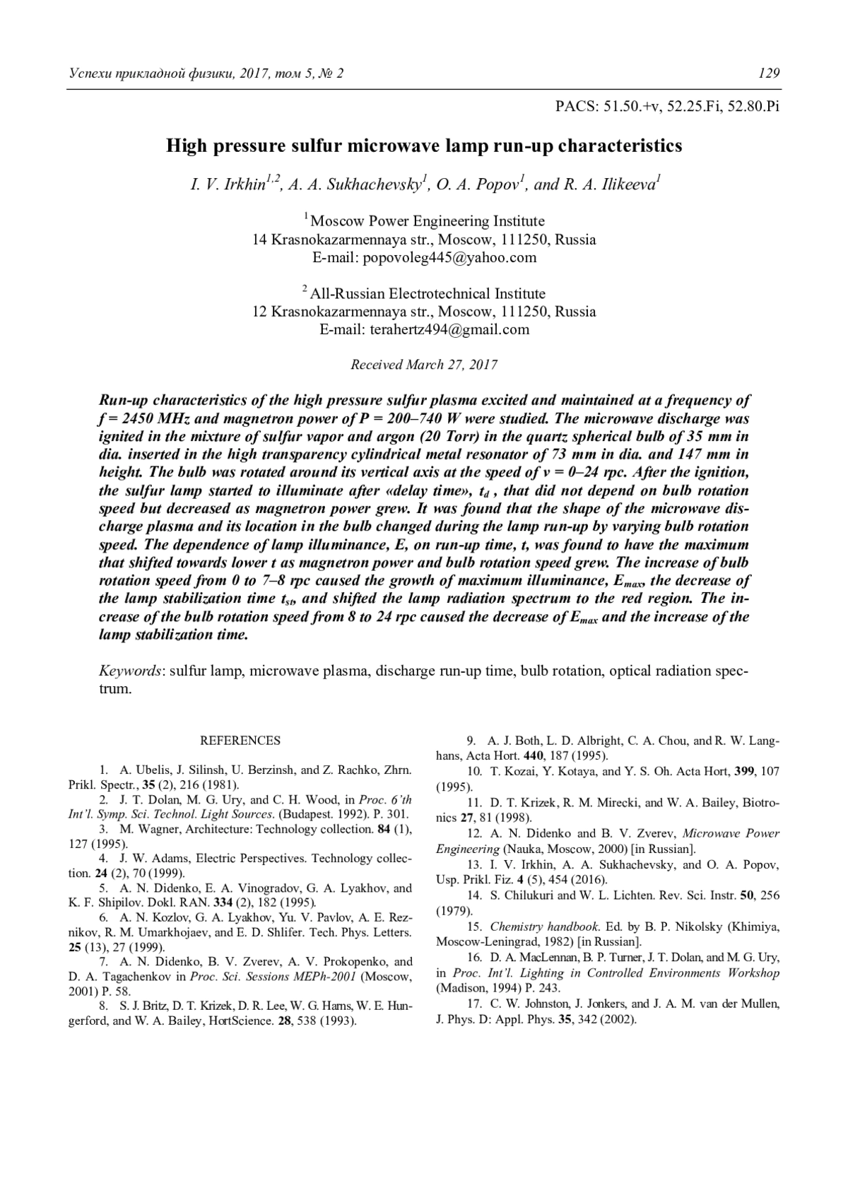 13. I. V. Irkhin, A. A. Sukhachevsky, and O. A. Popov, Usp. Prikl. Fiz. 4 (5), 454 (2016).