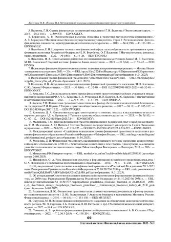 9. Клочкова, Н. В. Актуальные вопросы повышения финансовой грамотности населения / Н. В. Клочкова, С. Ю. Лисова // Форпост науки. - 2023. - № 4(66). - С. 32-40. DOI: 10.22394/2949-0855-2023-4-66-32-40 EDN: NXNJCC