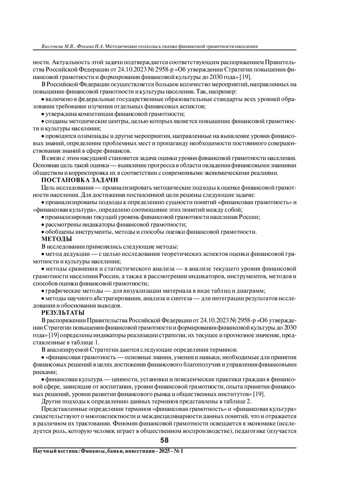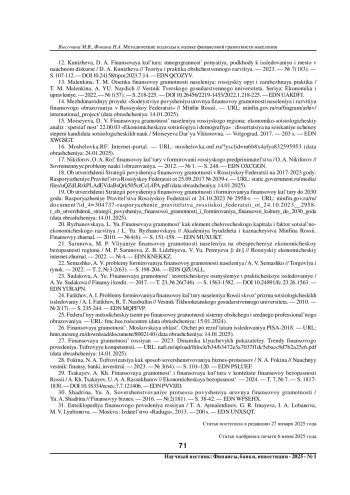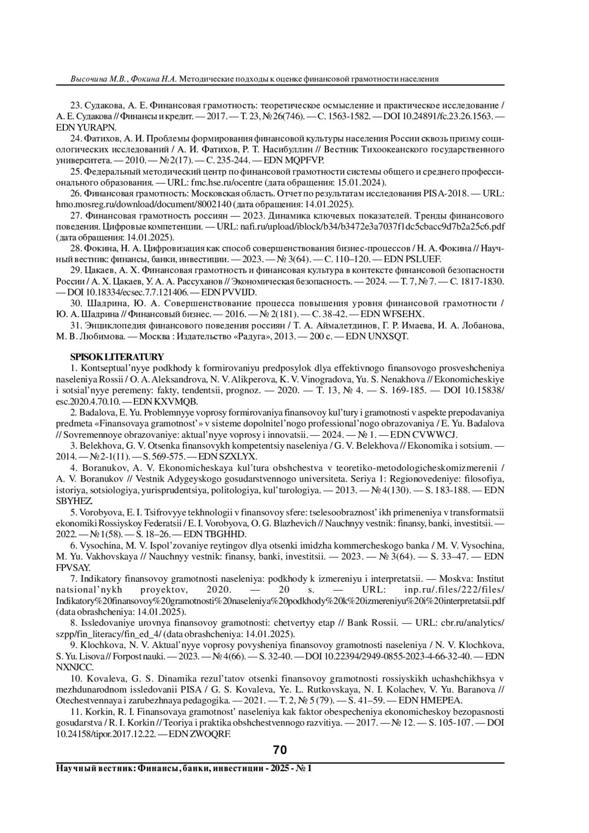 1. Концептуальные подходы к формированию предпосылок для эффективного финансового просвещения населения России / О. А. Александрова, Н. В. Аликперова, К. В. Виноградова, Ю. С. Ненахова // Экономические и социальные перемены: факты, тенденции, прогноз. - 2020. - Т. 13, № 4. - С. 169-185. DOI: 10.15838/esc.2020.4.70.10 EDN: KXVMQB