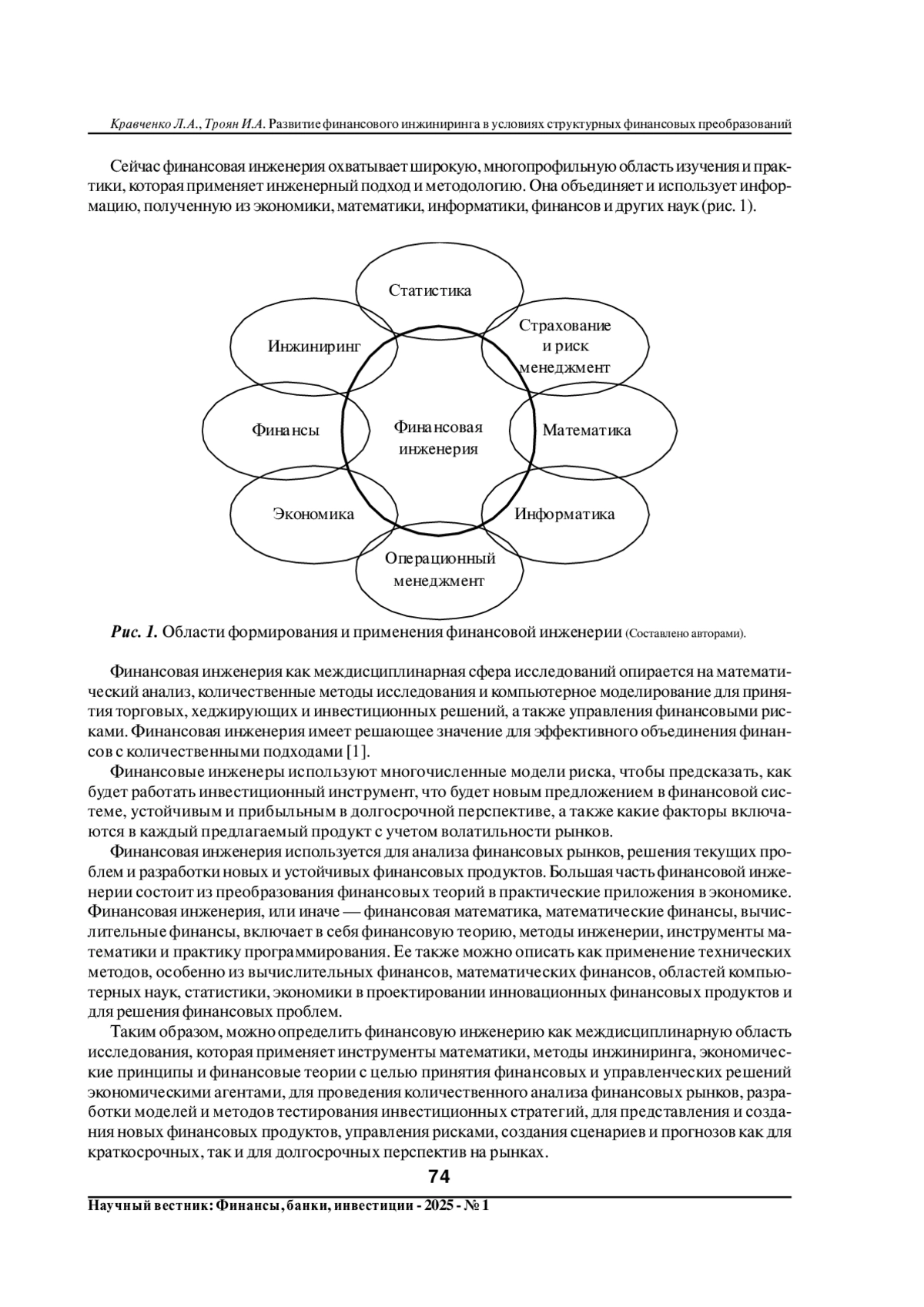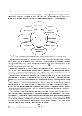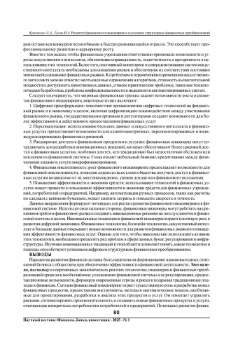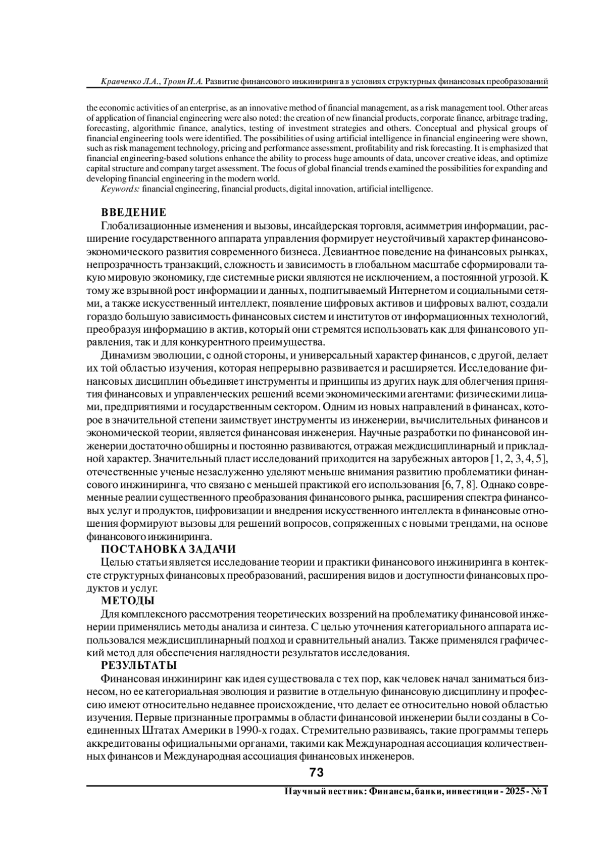 На основе категориального анализа финансовая инженерия определена как междисциплинарная область исследования, которая применяет инструменты математики, методы инжиниринга, экономические принципы и финансовые теории с целью принятия финансовых и управленческих решений экономическими агентами. Выявлено, что финансовая инженерии реализуются через использование финансового инжиниринга как вспомогательного способа управления хозяйственной деятельностью предприятия, как инновационного метода управления финансами, как инструмента управления рисками. Также отмечены и другие области применения финансового инжиниринга: создание новых финансовых продуктов, корпоративные финансы, арбитражная торговля, прогнозирование, алгоритмические финансы, аналитика, тестирование инвестиционных стратегий и другое. Выделены концептуальные и физические группы инструментов финансового инжиниринга. Показаны возможности применения искусственного интеллекта в финансовом инжиниринге, такие как, технология управления рисками, ценообразование и оценка производительности, прогнозирование прибыльности и риска. Подчеркивается, что решения на основе финансового инжиниринга повышают способность обрабатывать огромные объемы данных, раскрывать креативные идеи и оптимизировать структуру капитала и оценку целей компаний. В фокусе мировых финансовых трендов рассмотрены возможности для расширения и развития финансового инжиниринга в современном мире.