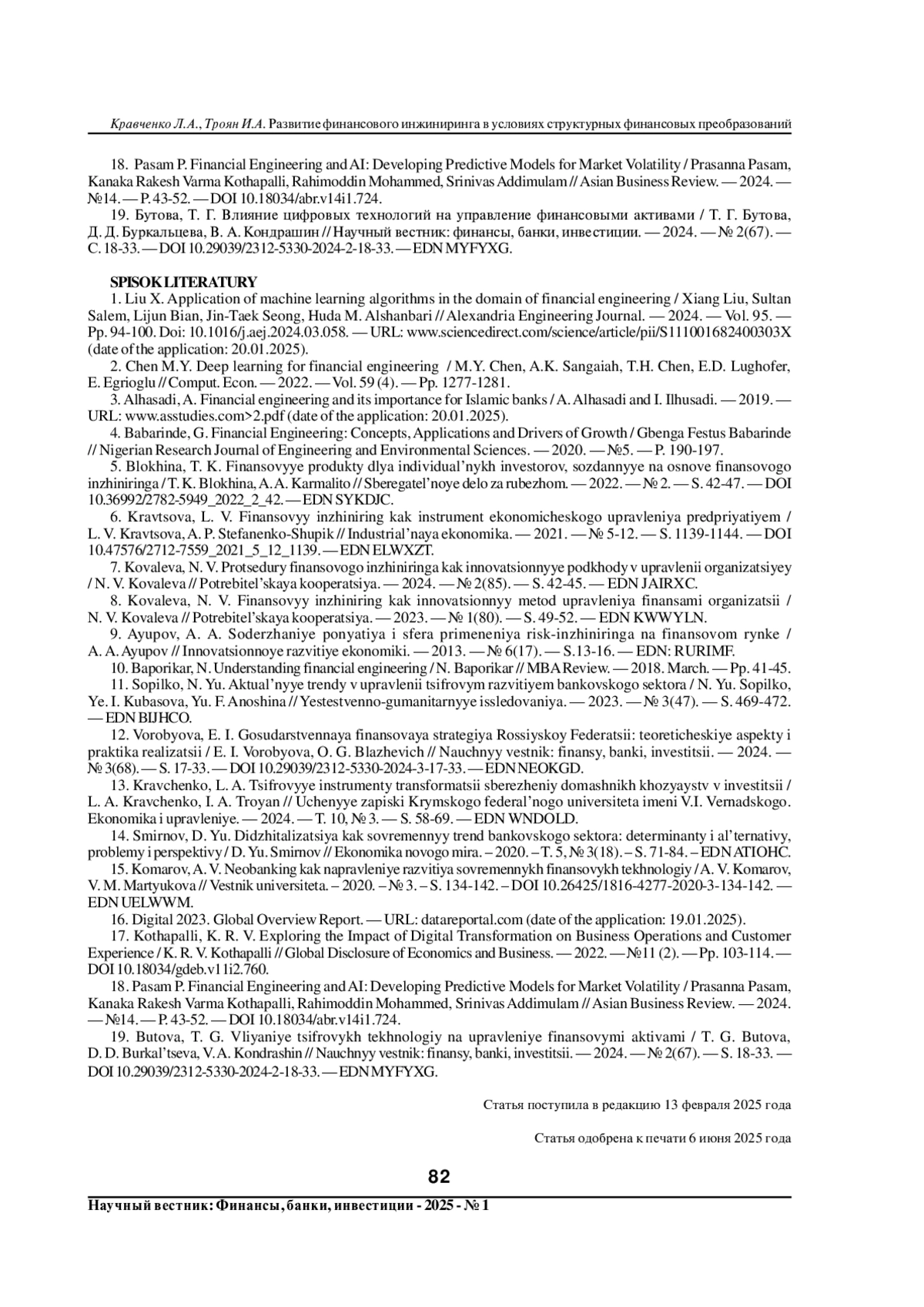 1. Liu X. Application of machine learning algorithms in the domain of financial engineering / Xiang Liu, Sultan Salem, Lijun Bian, Jin-Taek Seong, Huda M. Alshanbari // Alexandria Engineering Journal. - 2024. - Vol. 95. - Pp. 94-100. - URL: www.sciencedirect.com/science/article/pii/S111001682400303X (date of the application: 20.01.2025). DOI: 10.1016/j.aej.2024.03.058 EDN: ANVDWI