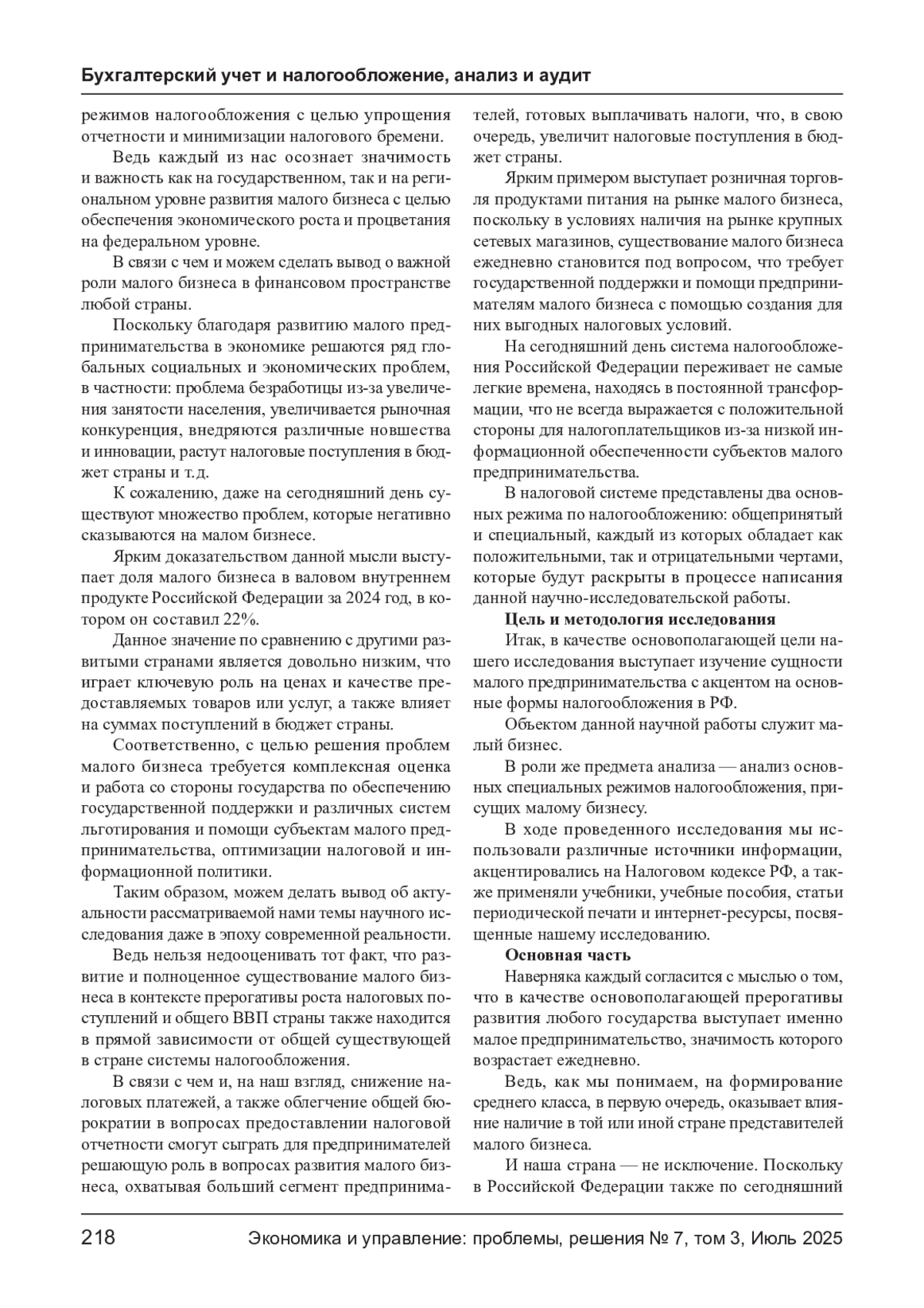 В данной статье раскрывается сущность и значимость малого бизнеса в эпоху современного XXI века, актуальность которого ежедневно возрастает. Ведь, как известно, объект нашего исследования занимает ключевую роль в социально - экономическом развитии любого государства, обеспечивая занятость населения, а также общую стабильность на рынке труда, увеличивая конкурентоспособность на мировой арене. Кроме того, следует отметить, что во многих странах именно малый бизнес выступает в качестве основного источника пополнений государственного бюджета страны. В связи с чем и можем отметить, что анализ системы налогообложения малого бизнеса с выявлением основных проблем и перспектив становится весьма актуальной задачей на сегодняшний день. Кроме того, в ходе проведенного исследования нами были рассмотрены основные формы налогообложения, в частности, специальные режимы, среди которых: упрощенная система налогообложения (УСН); патентная система налогообложения (ПСН); единый сельскохозяйственный налог (ЕСХН); налог на профессиональный доход (НПД) и автоматизированная упрощенная система налогообложения (АУСН). Соответственно, задачей предпринимателей становится выбор максимально оптимального и соответствующего его деятельности налогового режима с минимальными издержками производства. Тем самым ежедневно возрастает роль налогового стимулирования с целью успешного функционирования и развития малого бизнеса в той или иной стране.