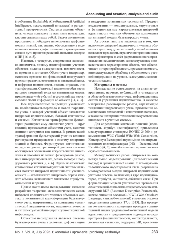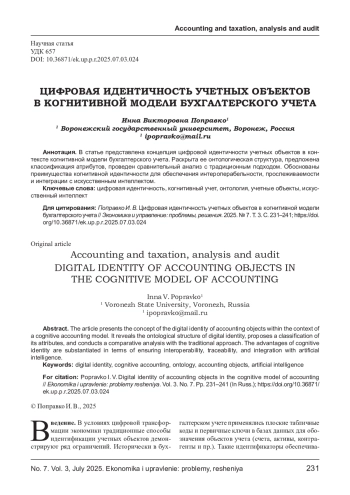 В статье представлена концепция цифровой идентичности учетных объектов в контексте когнитивной модели бухгалтерского учета. Раскрыта ее онтологическая структура, предложена классификация атрибутов, проведен сравнительный анализ с традиционным подходом. Обоснованы преимущества когнитивной идентичности для обеспечения интероперабельности, прослеживаемости и интеграции с искусственным интеллектом.