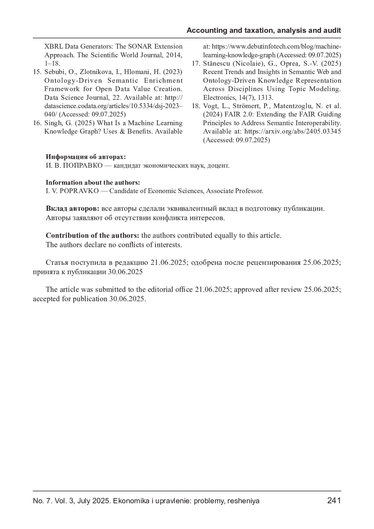 15. Sebubi O., Zlotnikova I., Hlomani H. Ontology- Driven Semantic Enrichment Framework for Open Data Value Creation [Электронный ресурс] // Data Science Journal. 2023. Vol. 22. URL: http://datascience.codata.org/articles// (дата обращения: 09.07.2025). DOI: 10.5334/dsj-2023-040 EDN: QMYKVR