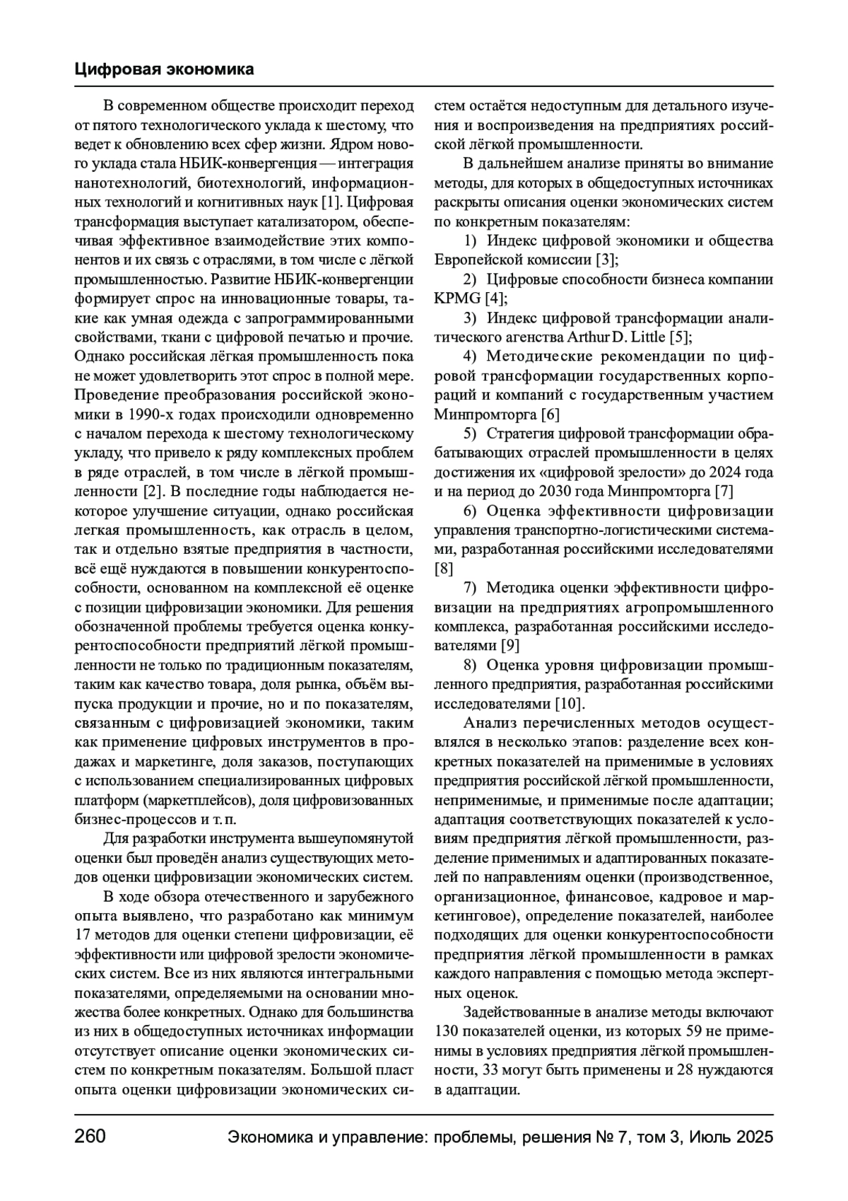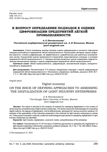 Статья посвящена анализу методов оценки цифровизации в контексте повышения конкурентоспособности предприятий лёгкой промышленности. Рассмотрены методики оценки цифровой зрелости, степени цифровизации, её эффективности, разработанные для различных экономических систем. Осуществлён анализ применимости показателей, представленных в методах, в условиях предприятий лёгкой промышленности. С помощью метода экспертных оценок определены предпочтительные методические подходы к оценке цифровизации предприятий лёгкой промышленности.