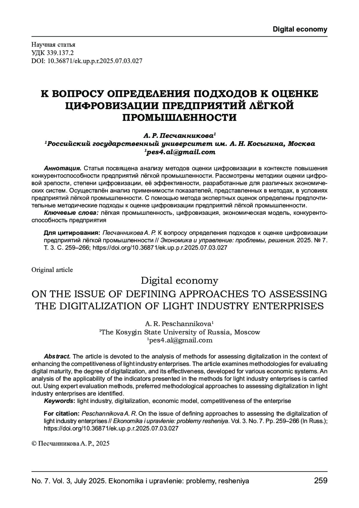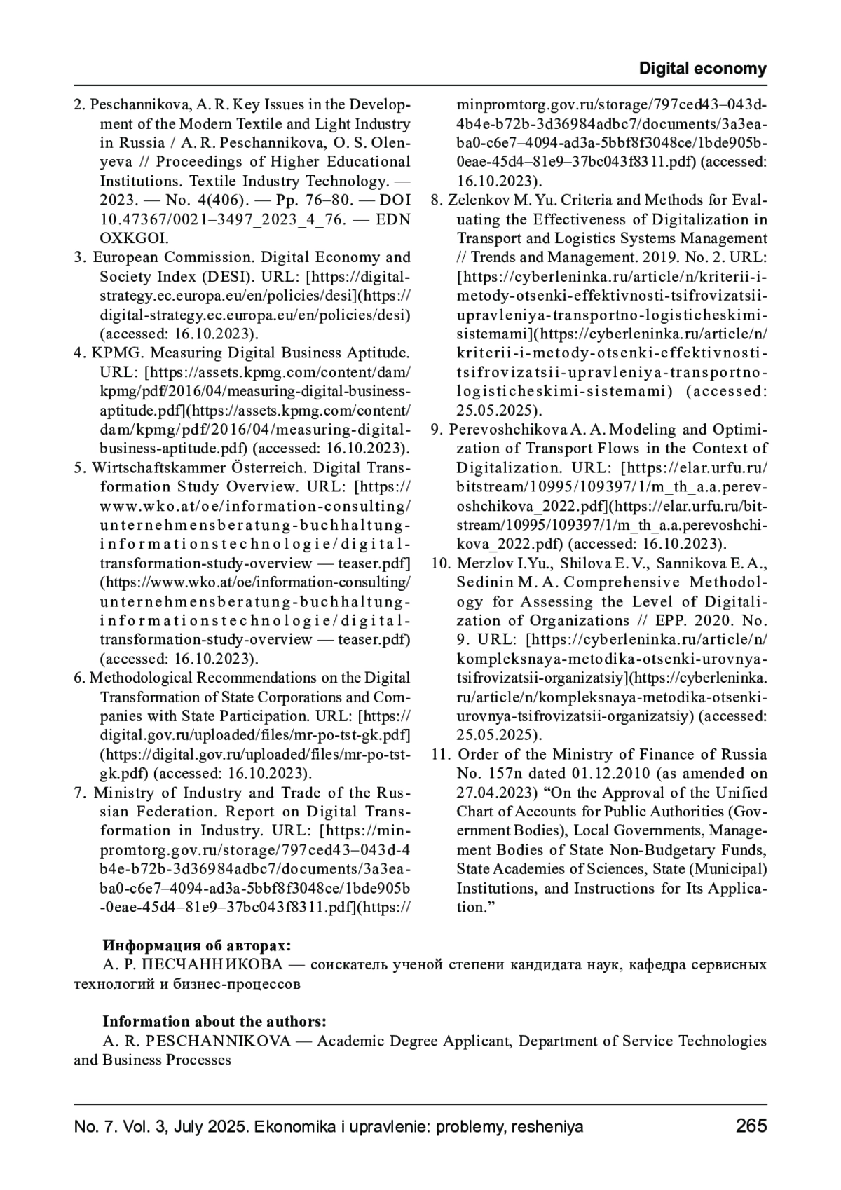 2. Песчанникова, А. Р. Основные проблемы развития современной текстильной и легкой промышленности в России / А. Р. Песчанникова, О. С. Оленева // Известия высших учебных заведений. Технология текстильной промышленности. - 2023. - № 4(406). - С. 76-80. 10.47367/0021- 3497_2023_4_76. DOI: 10.47367/0021-3497_2023_4_76 EDN: OXKGOI