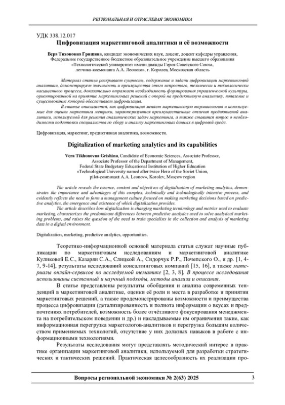 Материал статьи раскрывает сущность, содержание и задачи цифровизации маркетинговой аналитики, демонстрирует значимость и преимущества этого непростого, технически и технологически насыщенного процесса, доказательно отражает необходимость формирования управленческой культуры, ориентированной на принятие маркетинговых решений с опорой на предиктивную аналитику, появление и существование которой обеспечивает цифровизация. В статье описывается, как цифровизация меняет маркетинговую терминологию и используемые для оценки маркетинга метрики, характеризуются преимущественные отличия предиктивной аналитики, используемой для решения аналитических задач маркетинга, а также ставится вопрос о необходимости подготовки специалистов по сбору и анализу маркетинговых данных в цифровой среде.