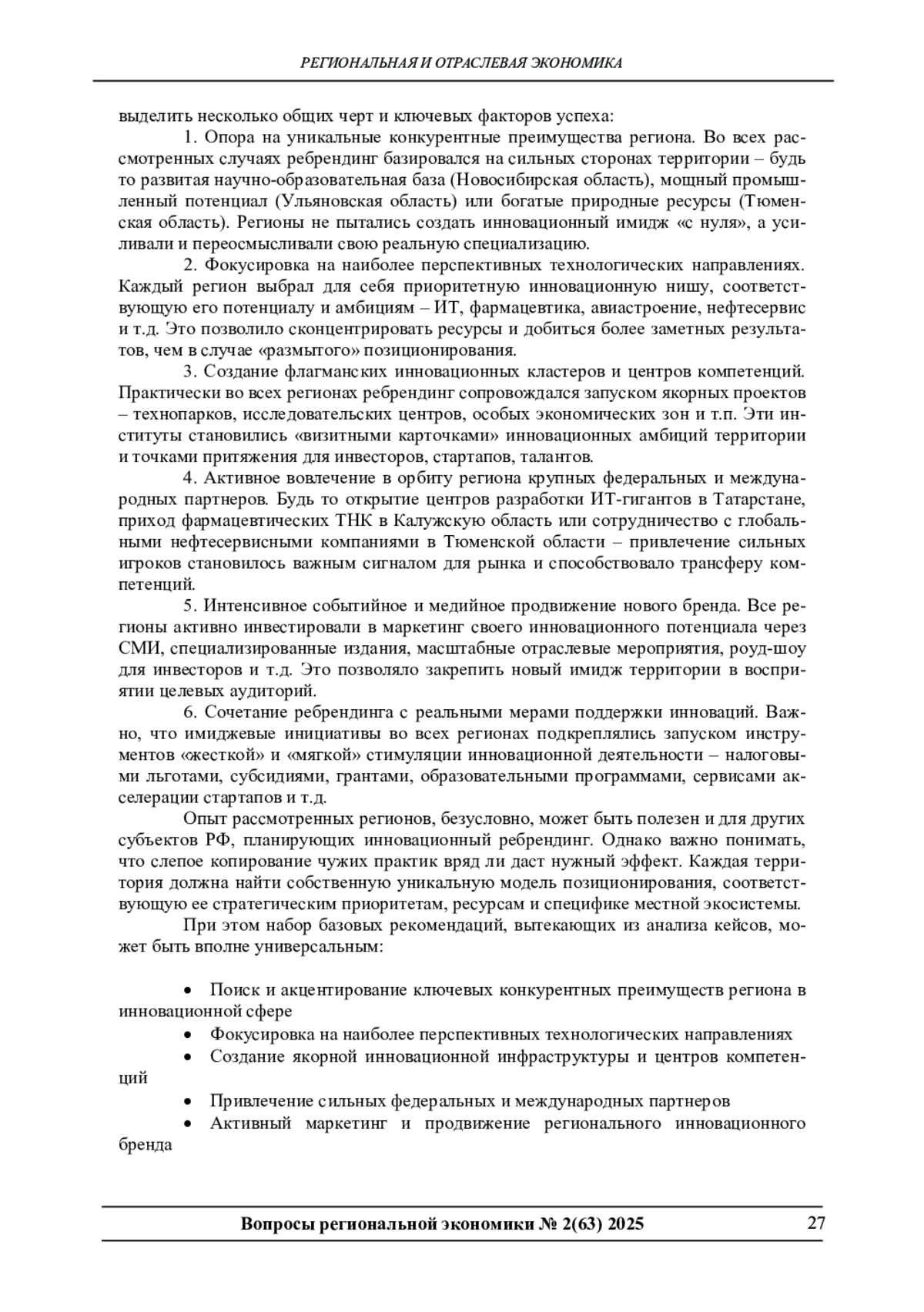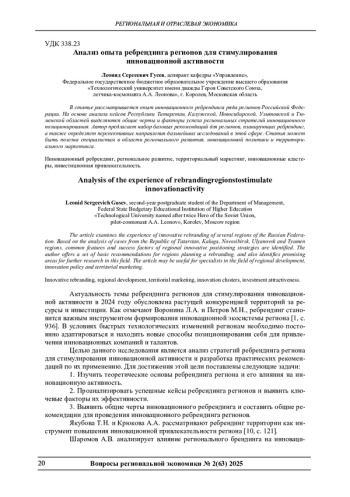 В статье рассматривается опыт инновационного ребрендинга ряда регионов Российской Федерации. На основе анализа кейсов Республики Татарстан, Калужской, Новосибирской, Ульяновской и Тюменской областей выделяются общие черты и факторы успеха региональных стратегий инновационного позиционирования. Автор предлагает набор базовых рекомендаций для регионов, планирующих ребрендинг, а также определяет перспективные направления дальнейших исследований в этой сфере. Статья может быть полезна специалистам в области регионального развития, инновационной политики и территориального маркетинга.