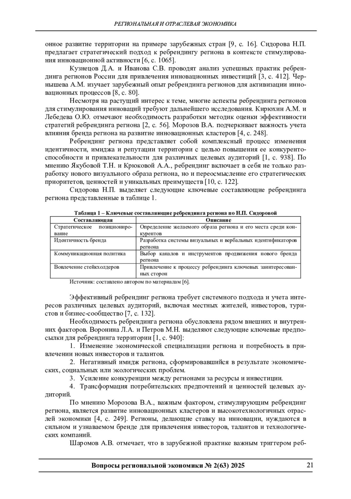 6. Сидорова Н.П. Стратегический подход к ребрендингу региона в контексте стимулирования инновационной активности // Региональная экономика: теория и практика.2022. Т. 20. № 6.С. 1063-1078.