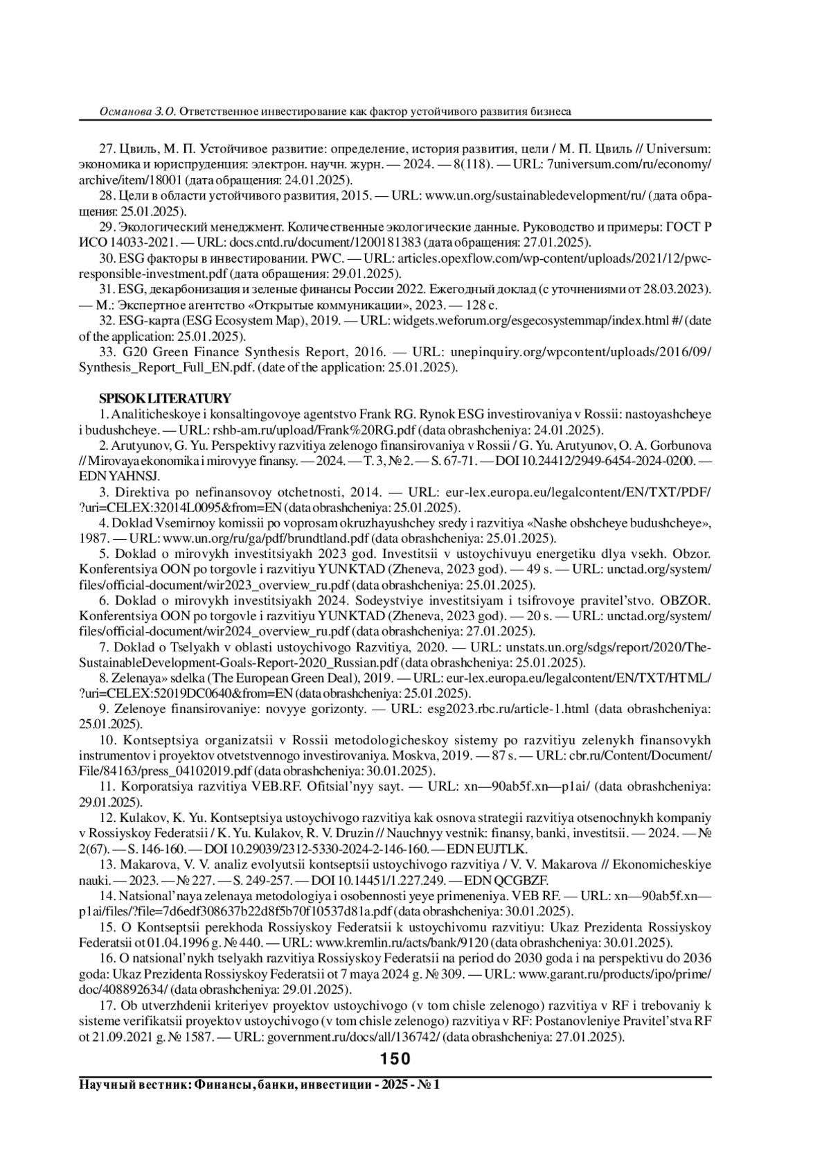 1. Аналитическое и консалтинговое агентство Frank RG. Рынок ESG инвестирования в России: настоящее и будущее. - URL: rshb-am.ru/upload/Frank%20RG.pdf (дата обращения: 24.01.2025).