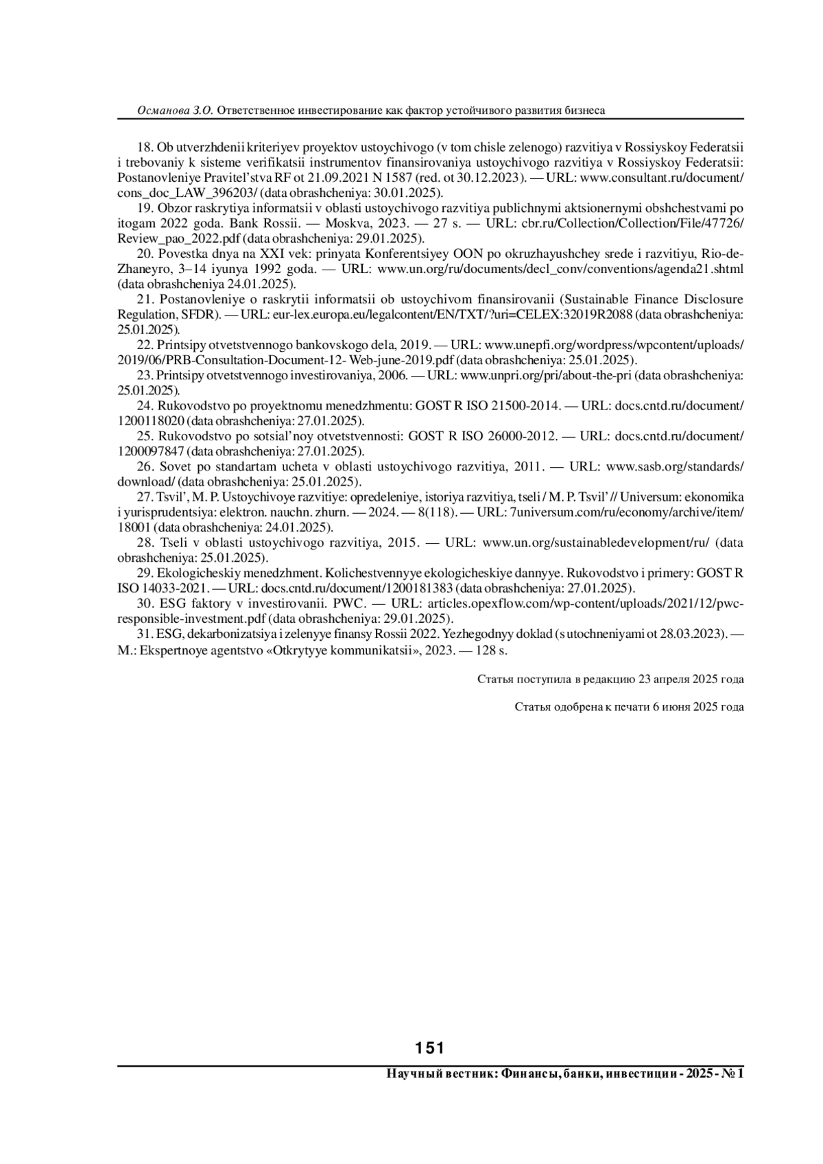 18. Об утверждении критериев проектов устойчивого (в том числе зеленого) развития в Российской Федерации и требований к системе верификации инструментов финансирования устойчивого развития в Российской Федерации: Постановление Правительства РФ от 21.09.2021 N 1587 (ред. от 30.12.2023). - URL: www.consultant.ru/document/cons_doc_LAW_396203/ (дата обращения: 30.01.2025).