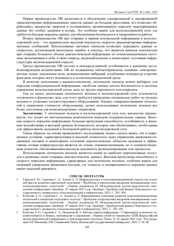 7. Васин Н. Н., Тарасова А. Е. Перспективы развития технологий передачи данных на сети железных дорог России // V Научный форум телекоммуникации: теория и технологии ТТТ-2021: Материалы XXIII Международной научно-технической конференции, Самара, 23-26 ноября 2021 года. Самара: Поволжский государственный университет телекоммуникаций и информатики, 2021. С. 199-200.