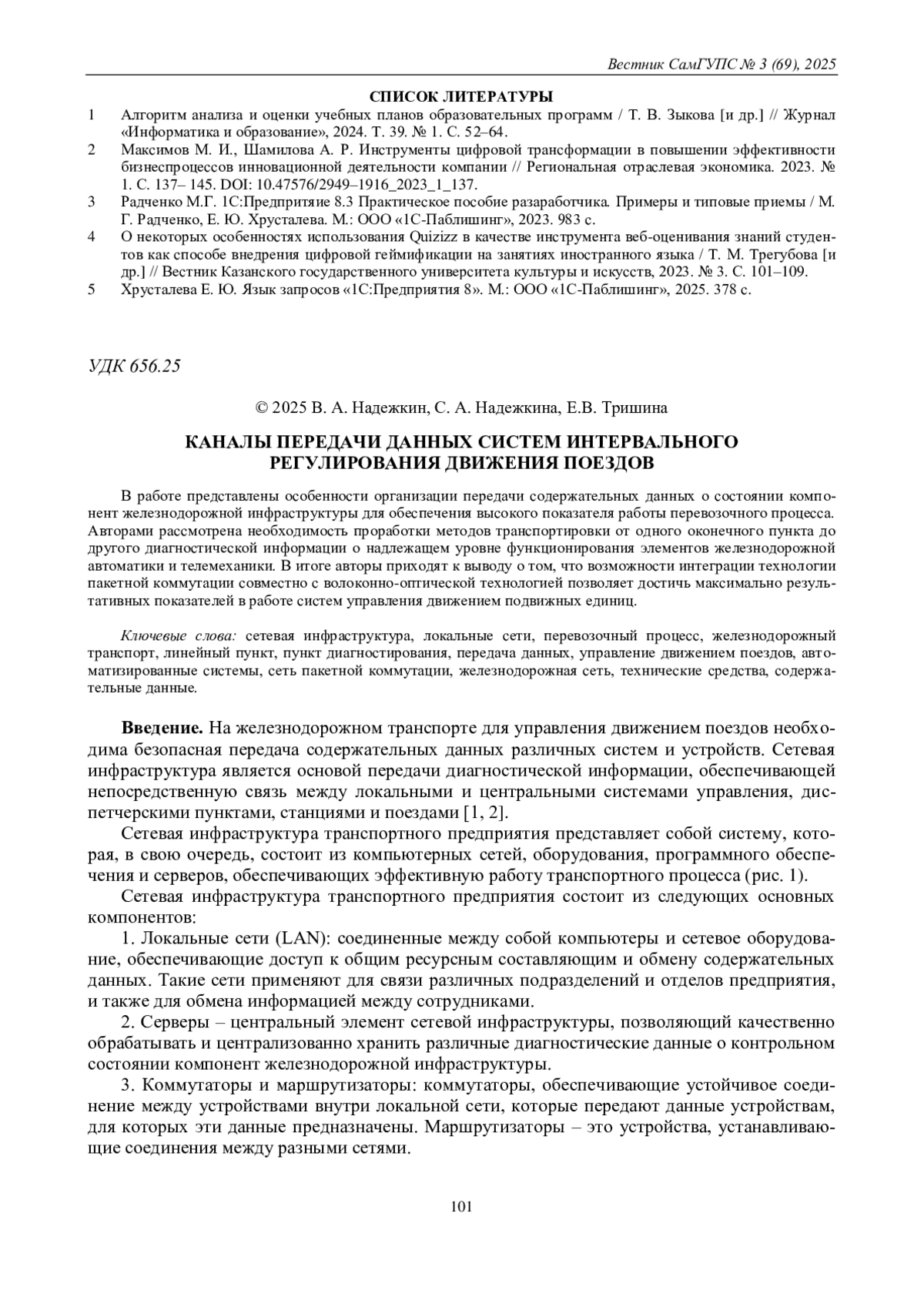 4. Сарычева С. А., Надежкин В. А., Кочетова А. О. Особенности Европейской системы управления железнодорожным движением (ERTMS) в развитии инновационной инфраструктуры // Тенденции развития логистики и управления цепями поставок: сборник статей III Международной научно-практической конференции, Казань, 21-24 сентября 2022 года. Курск: ЗАО “Университетская книга”, 2022. С. 133-138.