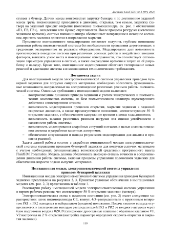 В данной работе представлена разработка имитационной модели электропневматической системы управления приводом бункерной задвижки, предназначенной для автоматизированной подачи и дозирования сыпу- чих материалов в железнодорожной отрасли.