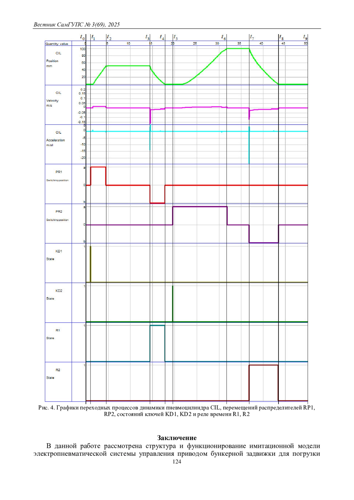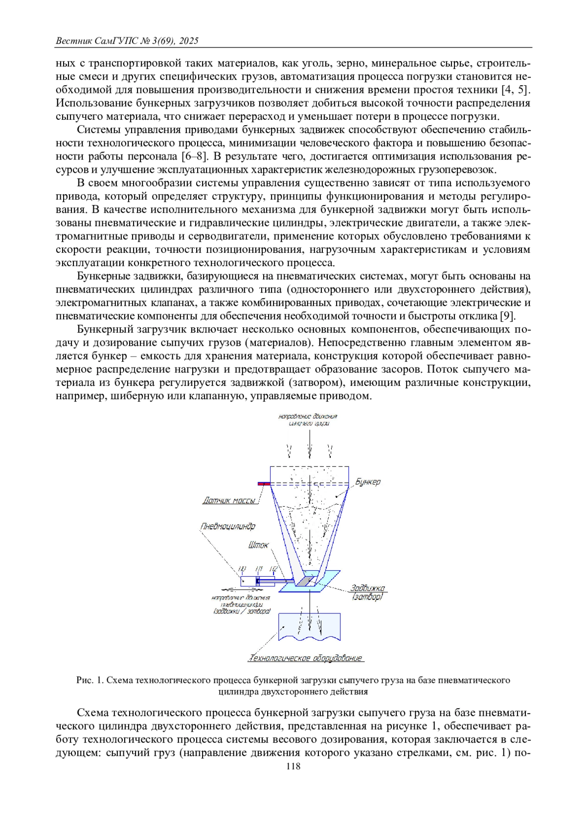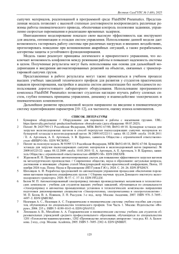 В данной работе представлена разработка имитационной модели электропневматической системы управления приводом бункерной задвижки, предназначенной для автоматизированной подачи и дозирования сыпучих материалов в железнодорожной отрасли. Модель создана с использованием программного пакета FluidSIM Pneumatics и базируется на двухстороннем пневматическом цилиндре с односторонним штоком. В работе подробно описана структура системы, включающая электромагнитные реле, распределители с пружинным возвратом, датчики положения и дроссельные клапаны, обеспечивающие точное управление положением задвижки и скорость ее открытия и закрытия. Разработанная имитационная модель позволяет воспроизводить несколько рабочих режимов работы системы, включая промежуточное положение заслонки с 50 % открытием и полное открытие на 100 %, а также обеспечивает временные задержки в конце хода штока пневмоцилиндра и возможность моделирования аварийных ситуаций. Такой подход дает возможность анализа динамики работы системы, оценки устойчивости при различных нагрузках, а также тестирования защитных алгоритмов. Результаты моделирования показывают высокую точность воспроизведения процессов и позволяют оптимизировать параметры управления для повышения эффективности технологического процесса погрузки сыпучих грузов. Разработанная модель может быть успешно применена как в промышленном производстве для совершенствования процессов транспортировки и дозирования материалов, так и в учебном процессе технических вузов для наглядного изучения принципов работы электропневматических систем, развития практических навыков проектирования и анализа автоматизированных систем.