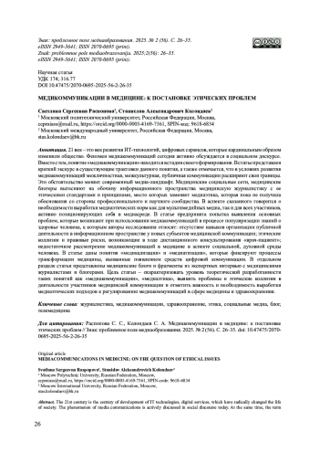 21 век - это век развития ИТ-технологий, цифровых сервисов, которые кардинальным образом изменили общество. Феномен медиакоммуникаций сегодня активно обсуждается в социальном дискурсе. Вместе с тем, понятие «медиакоммуникации» находится в стадиисвоегоформирования. В статье представлен краткий экскурс в существующие трактовки данного понятия, а также отмечается, что в условиях развития медиакоммуникаций межличностная, межкультурная, публичная коммуникации расширяют свои границы. Это обстоятельство меняет современный медиа-ландшафт. Медицинские социальные сети, медицинские блогеры вытесняют на обочину информационного пространства медицинскую журналистику с ее этическими стандартами и принципами, место которых заменяет медиаэтика, которая пока не получила обоснования со стороны профессионального и научного сообщества. В аспекте сказанного говорится о необходимости выработки медиаэтических норм как для мультимедийных медиа, так и для всех участников, активно позиционирующих себя в медиасреде. В статье предпринята попытка выявления основных проблем, которые возникают при использовании медиакоммуникаций в процессе популяризации знаний о здоровье человека, к которым авторы исследования относят: отсутствие навыков организации публичной деятельности в информационном пространстве у новых субъектов медицинской коммуникации; этические коллизии и правовые риски, возникающие в ходе дистанционного консультирования «врач-пациент»; недостаточное рассмотрение медиакоммуникаций в медицине в аспекте социальной, духовной среды человека. В статье даны понятия «медикализация» и «медиатизация», которые фиксируют процессы трансформации медицины, вызванные появлением средств цифровой коммуникации. В отдельном разделе статьи представлены медицинские блоги и фрагменты из экспертных интервью с медицинскими журналистами и блогерами. Цель статьи - охарактеризовать уровень теоретической разработанности таких понятий как «медиакоммуникации», «медиаэтика», выявить проблемы и этические коллизии в деятельности участников медицинской коммуникации и отметить важность и необходимость выработки медиаэтических подходов к регулированию медиакоммуникаций в сфере медицины и здравоохранения.