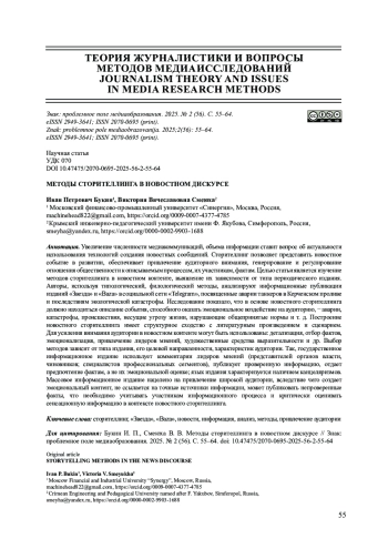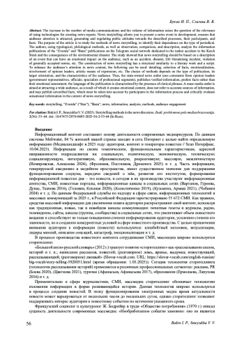 Увеличение численности медиакоммуникаций, объема информации ставит вопрос об актуальности использования технологий создания новостных сообщений. Сторителлинг позволяет представить новостное событие в развитии, обеспечивает привлечение аудиторного внимания, генерирование и регулирование отношения общественности к описываемым процессам, их участникам, фактам. Целью статьи является изучение методов сторителлинга в новостном контенте, выявление их зависимости от типа периодического издания. Авторы, используя типологический, филологический методы, анализируют информационные публикации изданий «Звезда» и «Baza» в социальной сети «Telegram», посвященные аварии танкеров в Керченском проливе и последствиям экологической катастрофы. Исследование показало, что в основе новостного сторителлинга должно находиться описание события, способного оказать эмоциональное воздействие на аудиторию, - аварии, катастрофы, происшествия, несущие угрозу жизни, нарушающие общепринятые нормы и т. д. Построение новостного сторителлинга имеет структурное сходство с литературным произведением и сценарием. Для усиления внимания аудитории в новостном контенте могут быть использованы: детализация, отбор фактов, эмоционализация, привлечение лидеров мнений, художественные средства выразительности и др. Выбор методов зависит от типа издания, его целевой направленности, характеристик аудитории. Так, государственное информационное издание использует комментарии лидеров мнений (представителей органов власти, чиновников; специалистов профессиональных сегментов), публикует проверенную информацию, отдает предпочтение фактам, а не их эмоциональной оценке; язык издания характеризуется наличием канцеляризмов. Массовое информационное издание нацелено на привлечение широкой аудитории, вследствие чего создает эмоциональный контент, не ссылается на точные источники информации, может публиковать непроверенные факты, что необходимо учитывать участникам информационного процесса и критически оценивать сенсационную информацию в контексте новостного сторителлинга.