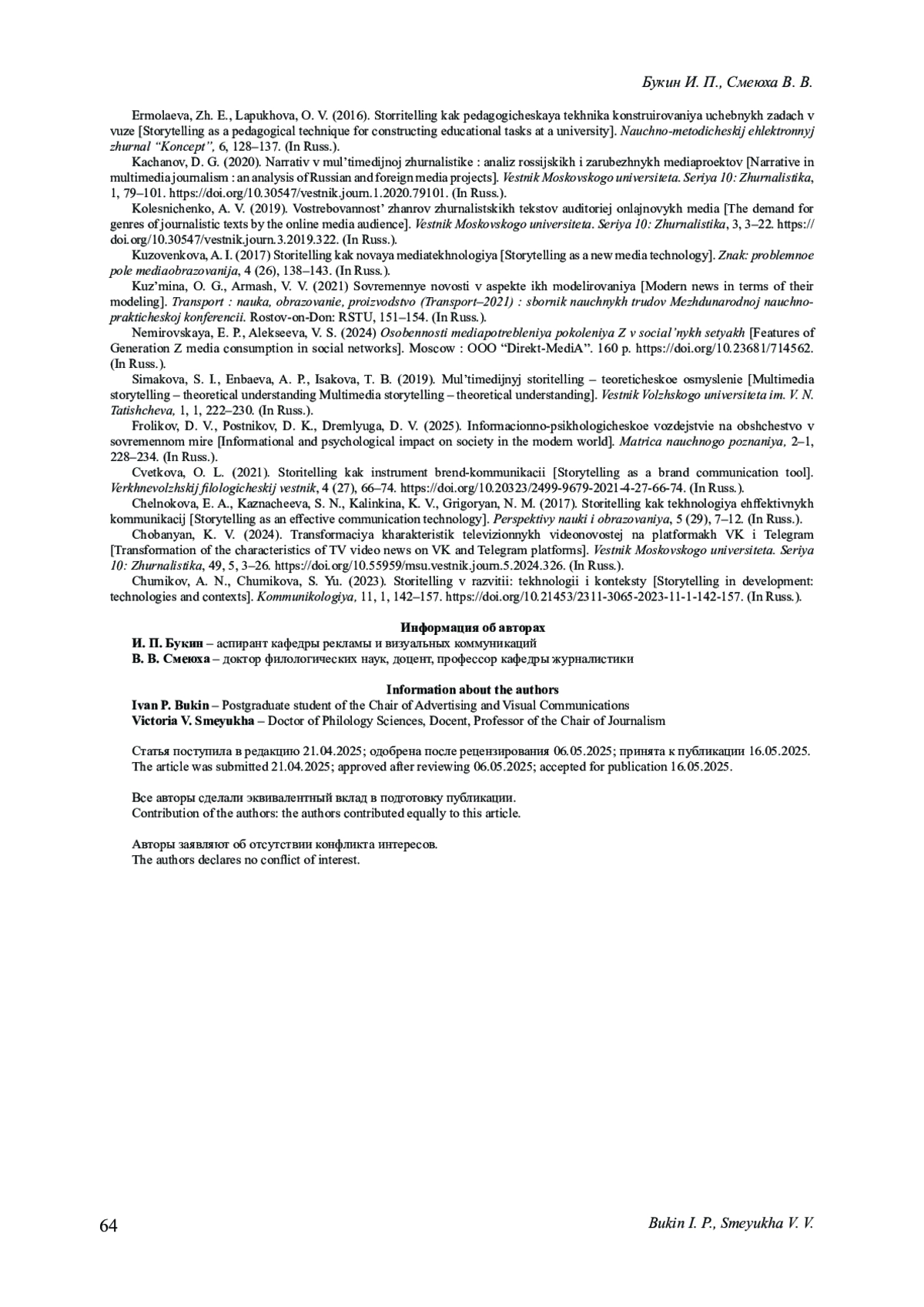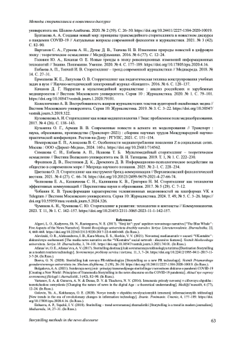 15. Симакова С. И., Енбаева А. П., Исакова Т. Б. Мультимедийный сторителлинг - теоретическое осмысление // Вестник Волжского университета им. В. Н. Татищева. 2019. Т. 1, № 1. С. 222-230. EDN: VWHMNY