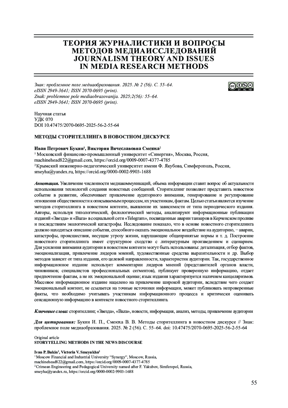 8. Енбаева А. П., Топчий И. В. Сторителлинг - тренд современной журналистики // Медиасреда. 2018. № 14. С. 27-31. EDN: YOYZJJ