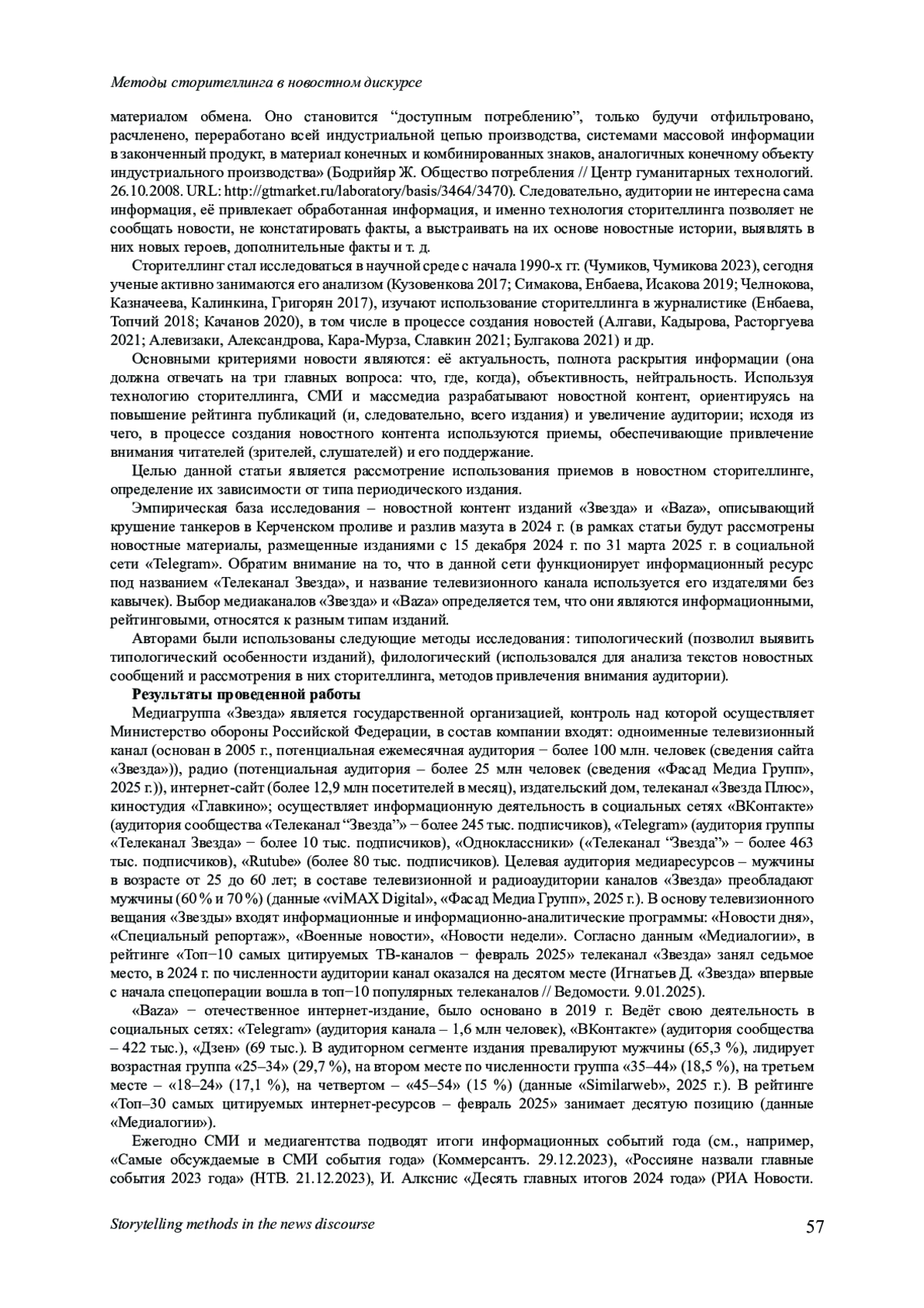 2. Алевизаки О. Р., Александрова И. Б., Кара-Мурза Е. С., Славкин В. В. Новостной медианарратив в соцсети “ВКонтакте”: дискурсивные особенности // Вестник Московского университета. Серия 10: Журналистика. 2021. № 3. С. 74-101. DOI: 10.30547/vestnik.journ.3.2021.74101 EDN: WDLCZQ
