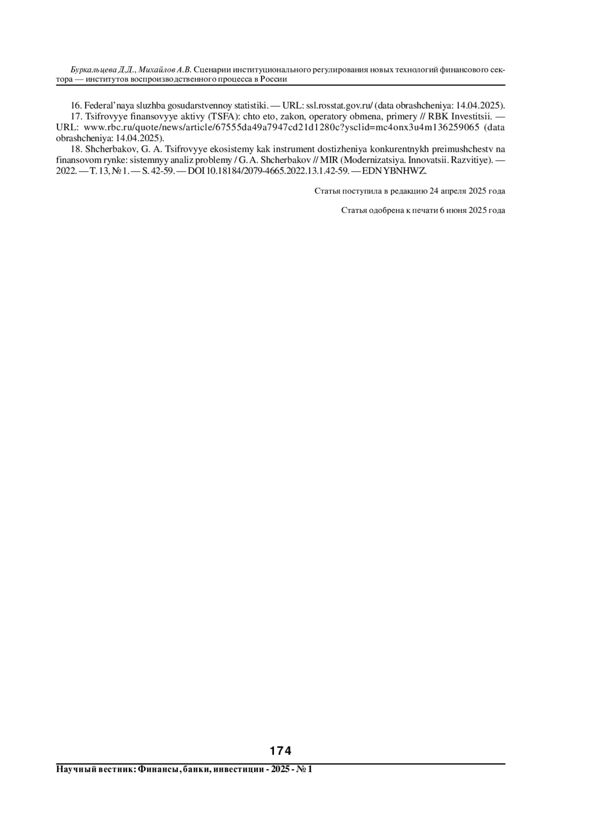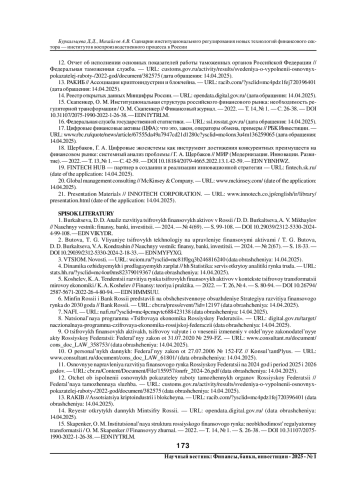 1. Буркальцева, Д. Д. Анализ развития цифровых финансовых активов в России / Д. Д. Буркальцева, А. В. Михайлов // Научный вестник: финансы, банки, инвестиции. - 2024. - № 4(69). - С. 99-108. DOI: 10.29039/2312-5330-2024-4-99-108 EDN: VIKYDR