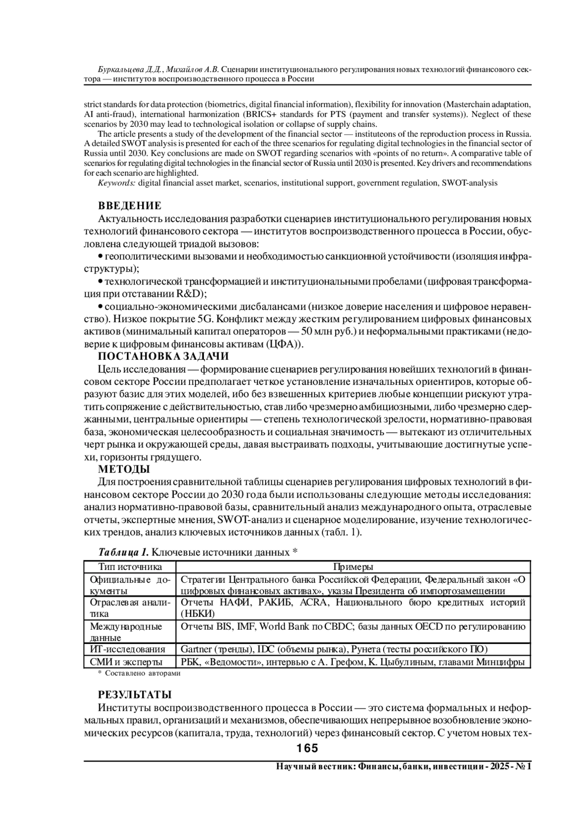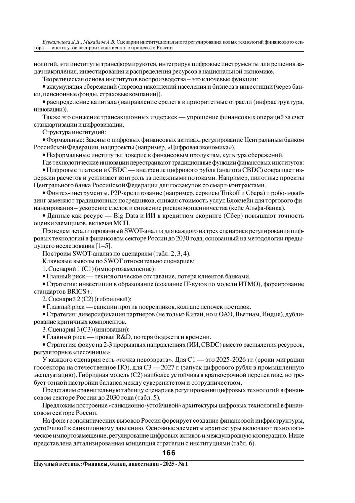 Актуальность исследования определяется синергией экстремальных вызовов для России, когда санкции требуют технологического суверенитета, но глобальные тренды диктуют необходимость интеграции с «незападными» партнерами. Успешное регулирование при этом должно сочетать жесткие нормы для защиты данных (биометрия, цифровые финансовые активы), гибкость для инноваций (адаптация Masterchain, ИИ-антифрод), международную гармонизацию (стандарты BRICS+ для СППС (системы платежей и переводов)). Пренебрежение этими сценариями к 2030 г. может привести к технологической изоляции или коллапсу цепочек поставок. В статье приведено исследование развития финансового сектора - институтов воспроизводственного процесса в России. Представлен детализированный SWOT-анализ для каждого из трех сценариев регулирования цифровых технологий в финансовом секторе России до 2030 года. Сделаны ключевые выводы по SWOT относительно сценариев с «точками невозврата». Представлена сравнительная таблица сценариев регулирования цифровых технологий в финансовом секторе России до 2030 года. Выделены ключевые драйверы и рекомендации для каждого сценария.