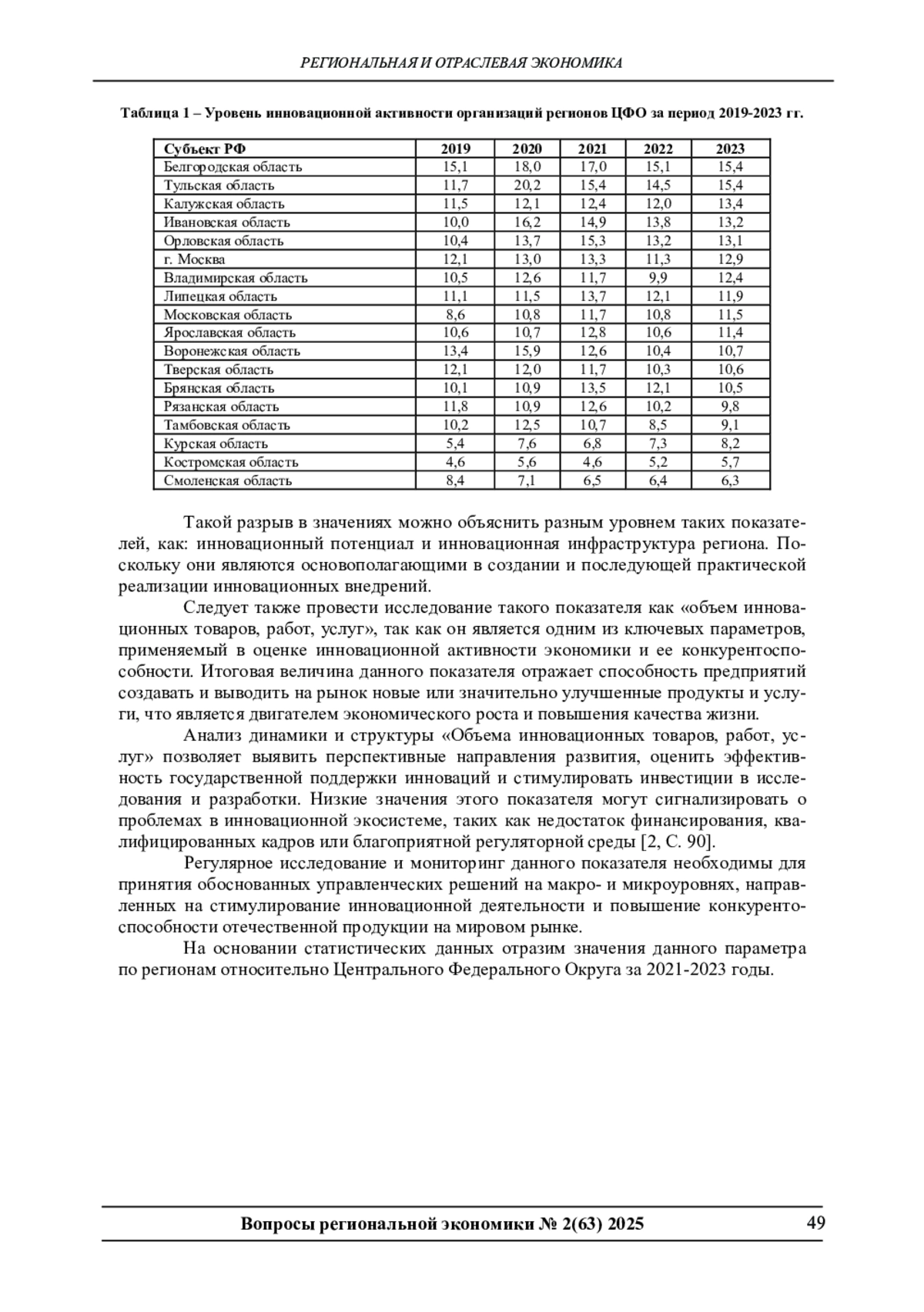 Целью настоящего исследования является оценка основных показателей, отражающих инновационный потенциал территории субъектов ЦФО РФ, выявление наиболее благоприятных условий и факторов, способствующих повышению региональной инновационной активности и укреплению социально-экономического положения территорий. Процессы инновационного и инвестиционного развития следует изучать как единое целое в виде комплексного процесса, подвергнутого управленческим воздействиям.