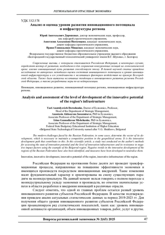 3. Дорошенко Ю.А., Иноземцева А.А. Современные методические подходы к оценке инновационного потенциала региона // Beneficium. 2022. № 2(43). С. 34-40. EDN: KMSCAP