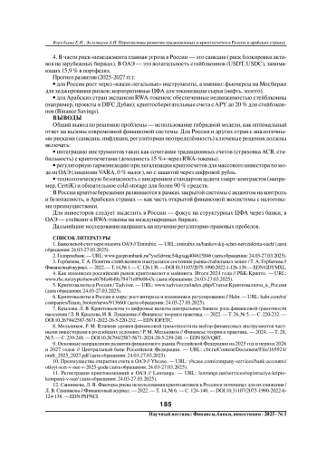 12. Санникова, Л. В. Факторы риска использования криптоактивов в России и потенциал для их снижения / Л. В. Санникова // Финансовый журнал. - 2022. - Т. 14, № 6. - С. 124-140. DOI: 10.31107/2075-1990-2022-6-124-138 EDN: PSFNCI