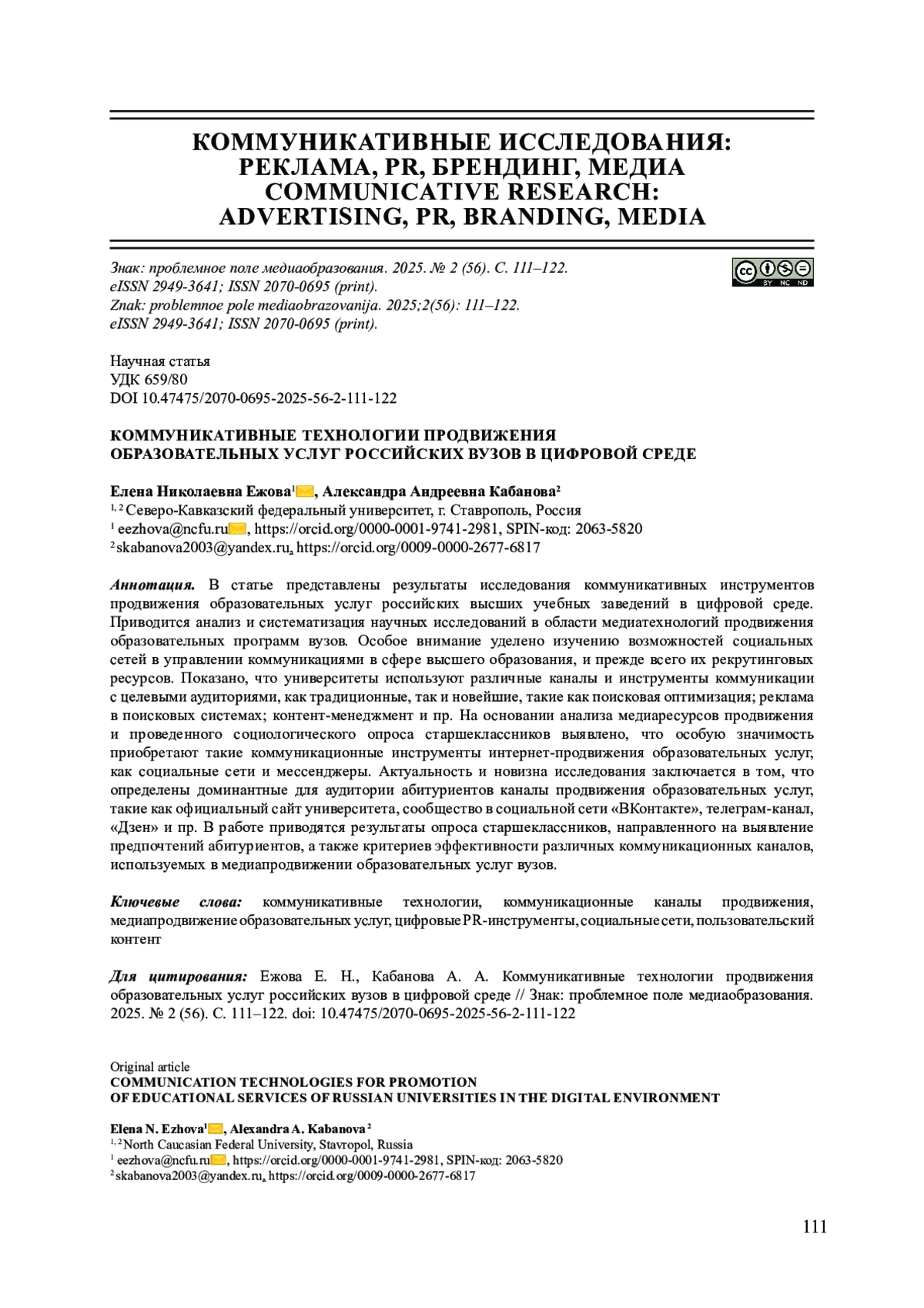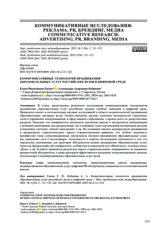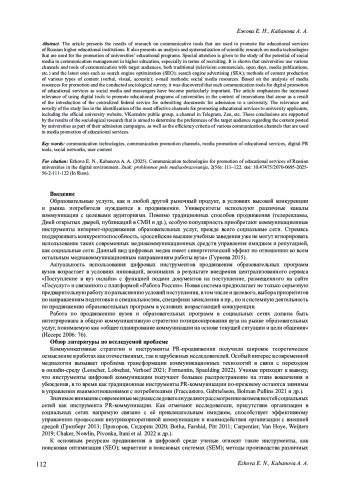 В статье представлены результаты исследования коммуникативных инструментов продвижения образовательных услуг российских высших учебных заведений в цифровой среде. Приводится анализ и систематизация научных исследований в области медиатехнологий продвижения образовательных программ вузов. Особое внимание уделено изучению возможностей социальных сетей в управлении коммуникациями в сфере высшего образования, и прежде всего их рекрутинговых ресурсов. Показано, что университеты используют различные каналы и инструменты коммуникации с целевыми аудиториями, как традиционные, так и новейшие, такие как поисковая оптимизация; реклама в поисковых системах; контент-менеджмент и пр. На основании анализа медиаресурсов продвижения и проведенного социологического опроса старшеклассников выявлено, что особую значимость приобретают такие коммуникационные инструменты интернет-продвижения образовательных услуг, как социальные сети и мессенджеры. Актуальность и новизна исследования заключается в том, что определены доминантные для аудитории абитуриентов каналы продвижения образовательных услуг, такие как официальный сайт университета, сообщество в социальной сети «ВКонтакте», телеграм-канал,«Дзен» и пр. В работе приводятся результаты опроса старшеклассников, направленного на выявление предпочтений абитуриентов, а также критериев эффективности различных коммуникационных каналов, используемых в медиапродвижении образовательных услуг вузов.