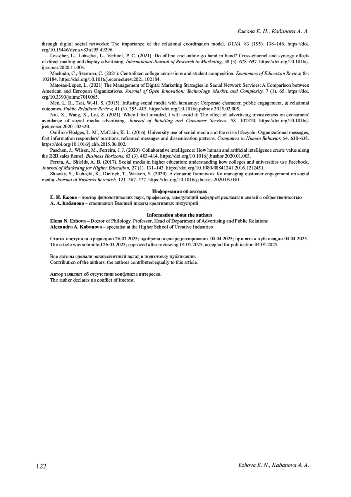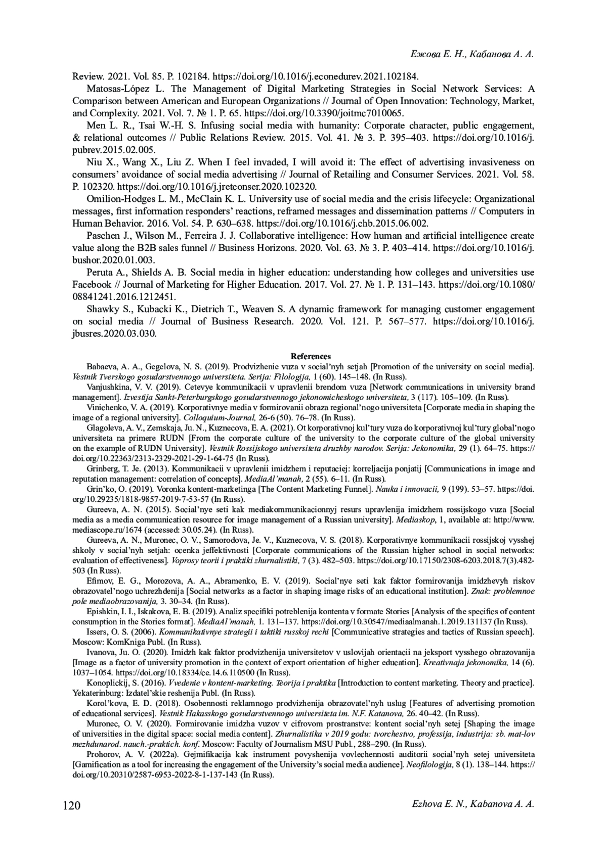 1. Бабаева А. А., Гегелова Н. С. Продвижение вуза в социальных сетях // Вестник Тверскогогосударственного университета. Серия: Филология. 2019. № 1 (60). С. 145-148.